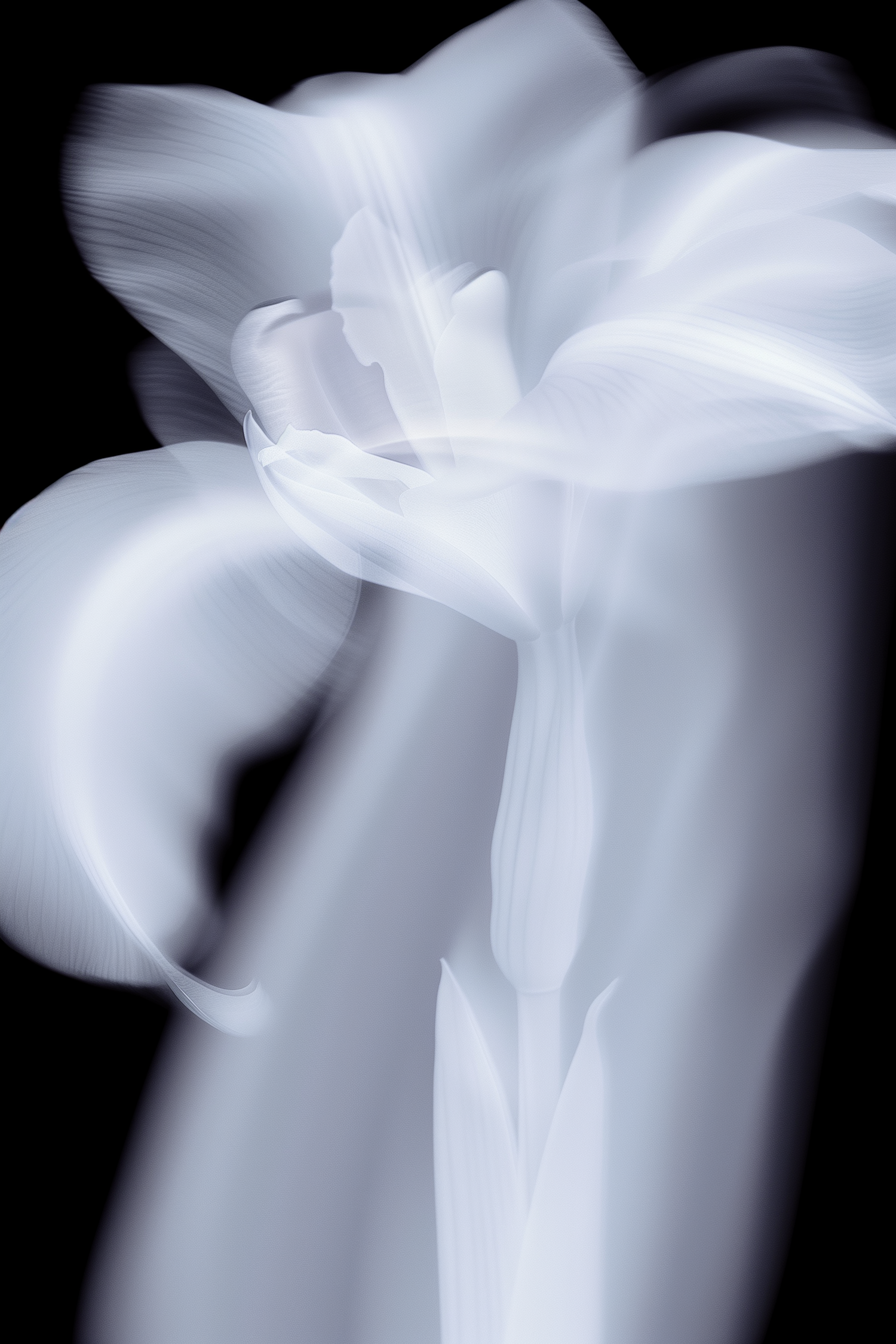 Ethereal white flower with glowing, translucent petals on a black background, creating a surreal and dreamlike visual effect.