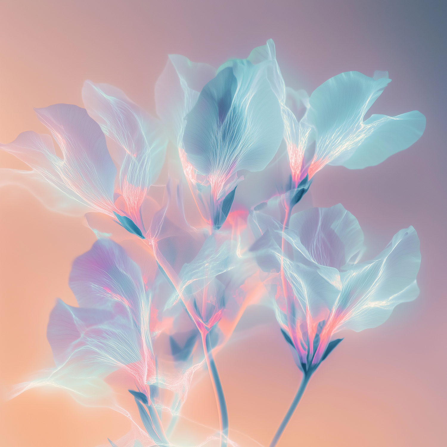 Ethereal glowing flowers with translucent petals in soft blue and pink hues, set against a dreamy peach and lavender gradient.
