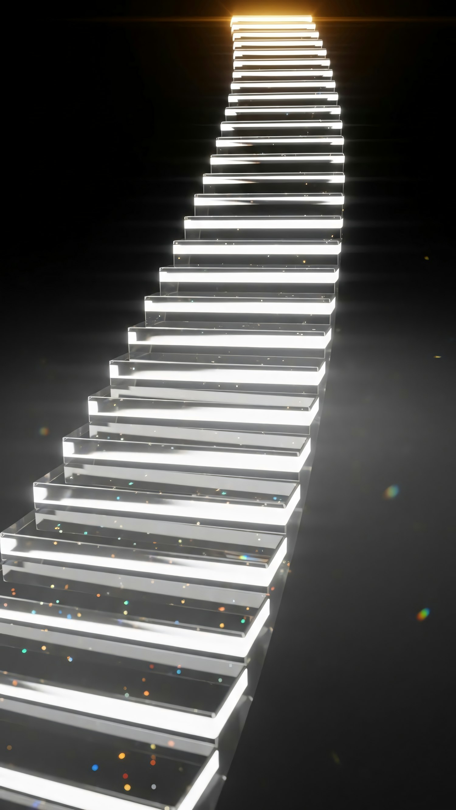 A glowing staircase ascends into darkness, illuminated by white light and surrounded by colorful particles, leading to a golden light.