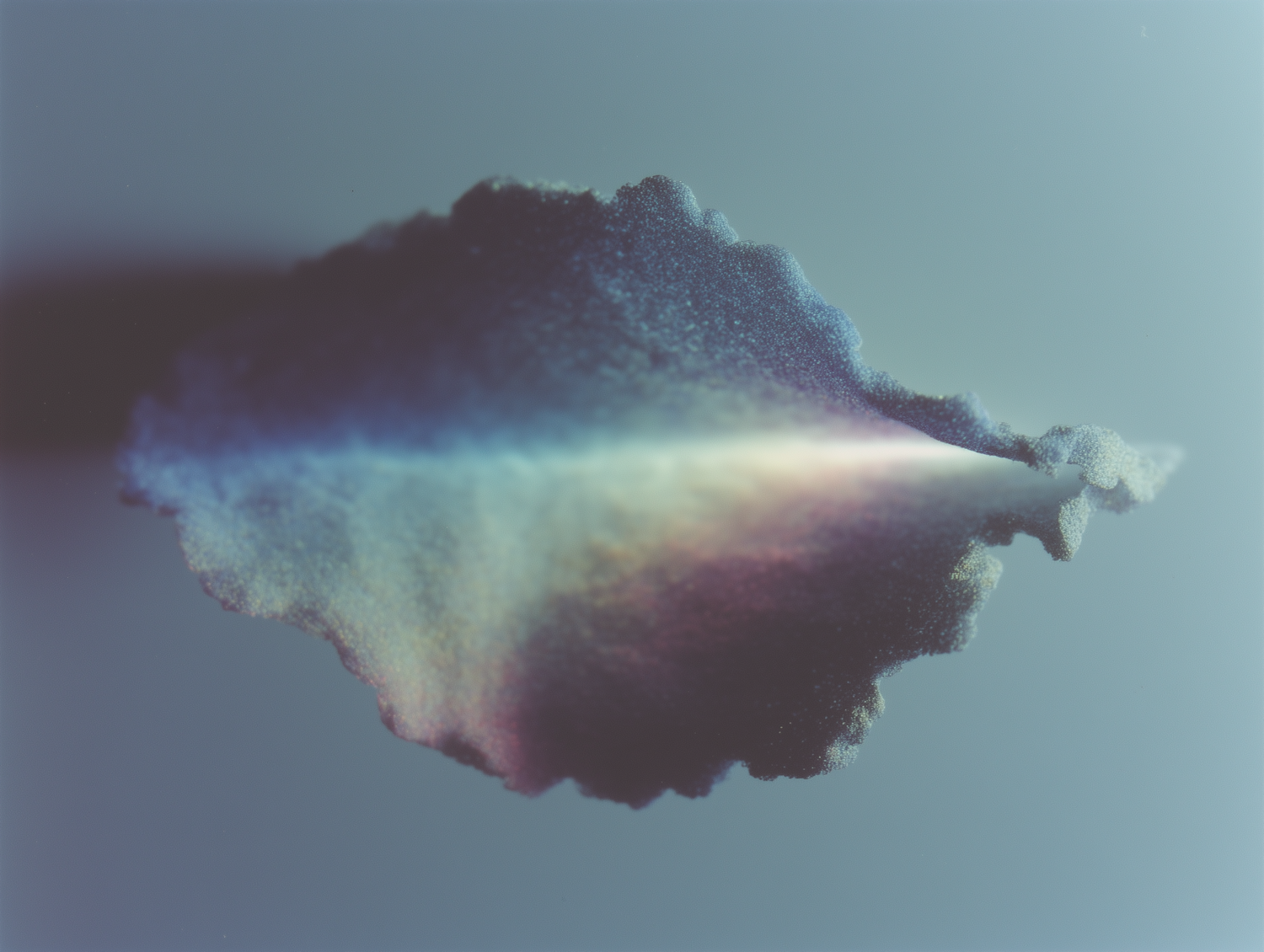 Abstract close-up of a colorful, cloud-like structure with granular texture and glowing light, set against a soft blue gradient background.