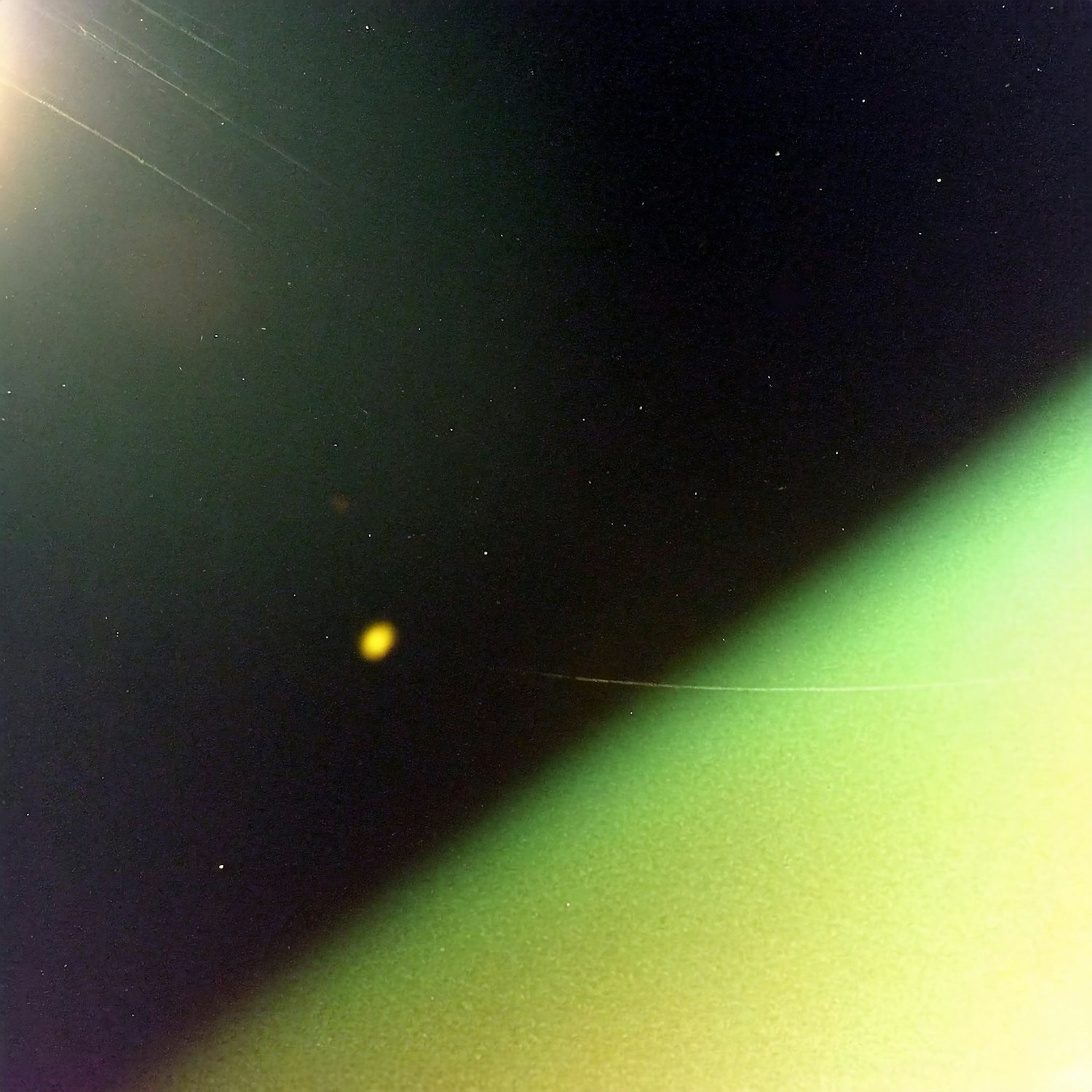 Abstract cosmic scene with bright light, dark shadows, and a yellow orb. Green hues and grainy texture create an ethereal feel.