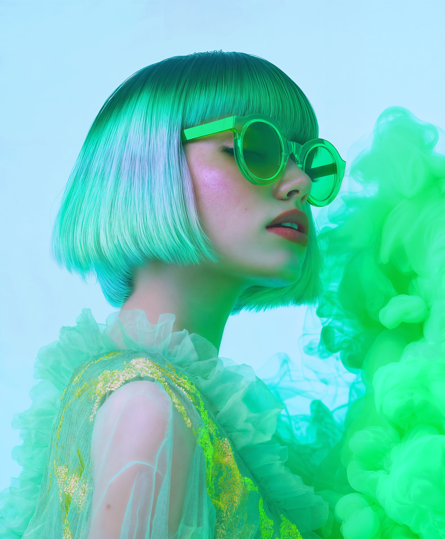 Vibrant portrait of a woman with green hair and sunglasses, set against a swirling green smoke background.