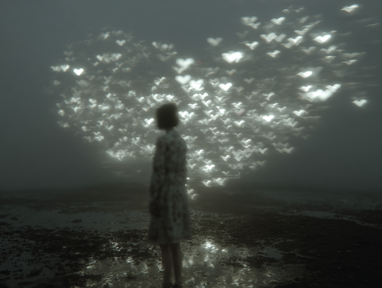 A silhouette in a misty setting faces glowing heart-shaped lights, creating a serene and dreamlike atmosphere.