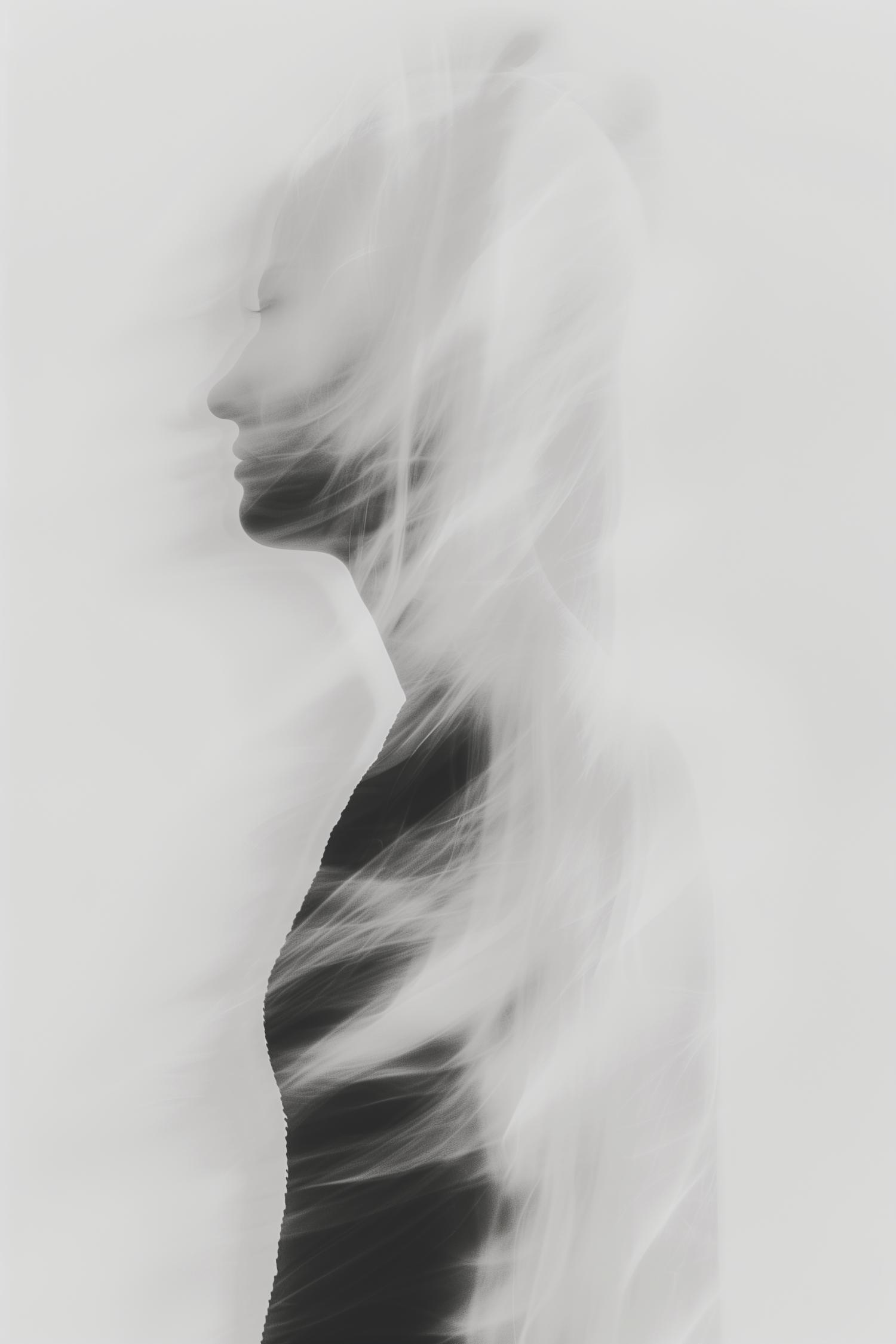 Ethereal grayscale profile of a human figure with flowing, translucent streaks creating a dreamlike, abstract effect.