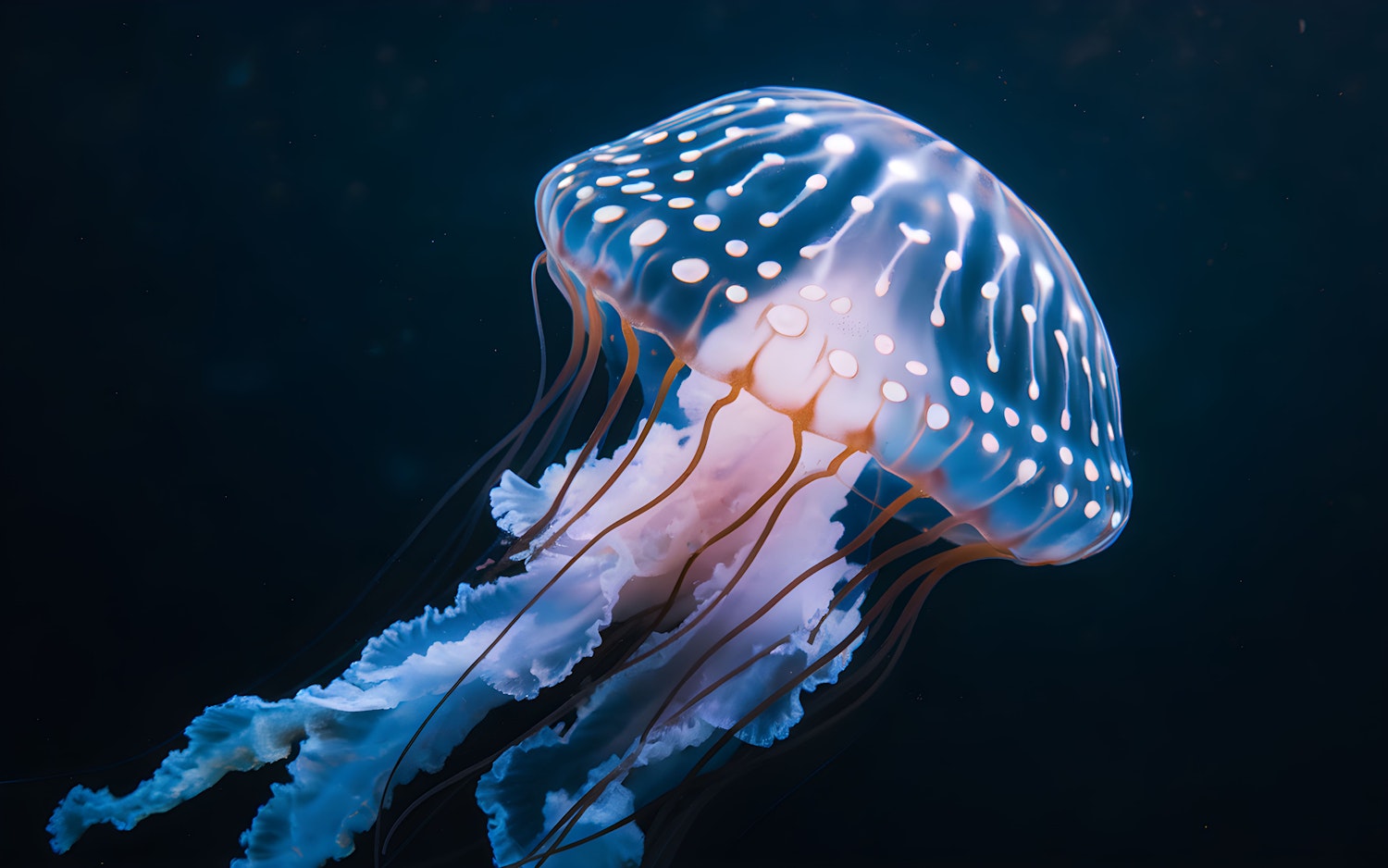 Graceful jellyfish with translucent bell and flowing tentacles in deep blue ocean, showcasing marine beauty and ethereal elegance.
