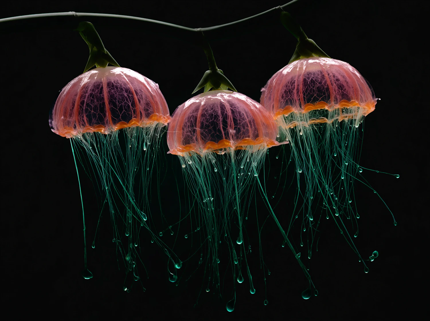 Three glowing jellyfish-like structures with pink domes and green tendrils against a dark background, creating a surreal visual.