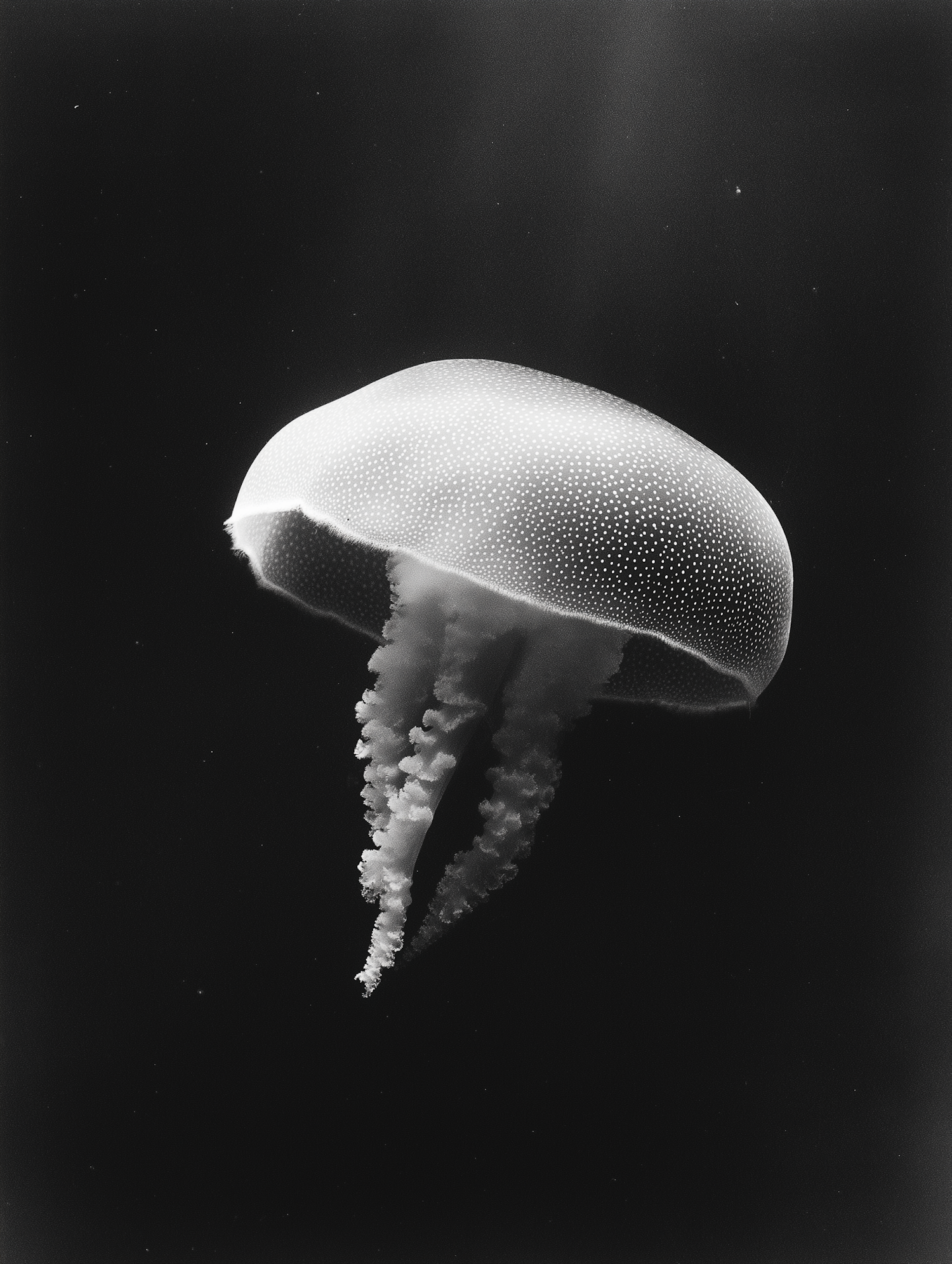 Ethereal black-and-white photo of a jellyfish with dotted patterns, floating in dark water with soft, trailing tentacles.