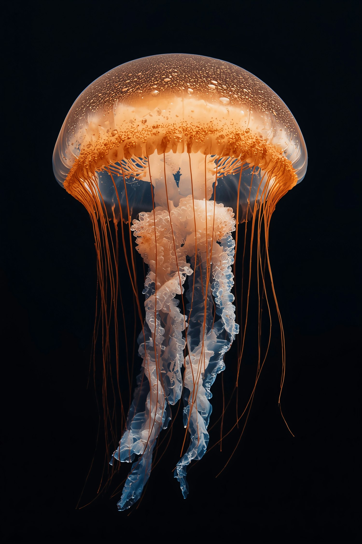 A glowing orange jellyfish with intricate details and long tentacles floats against a dark background, showcasing its ethereal beauty.