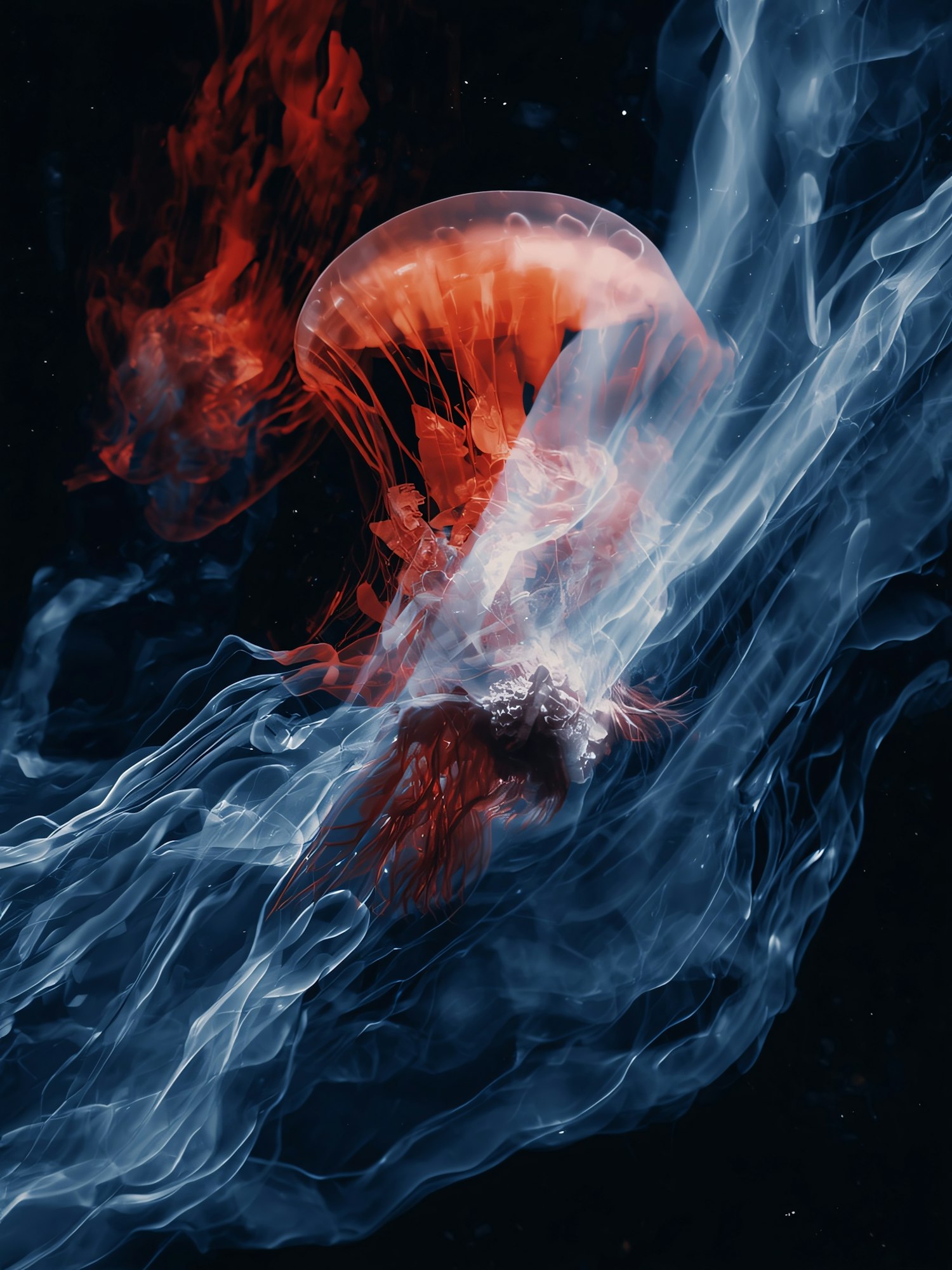 A glowing jellyfish with red and orange hues floats in a dark ocean, surrounded by ethereal blue and white currents.