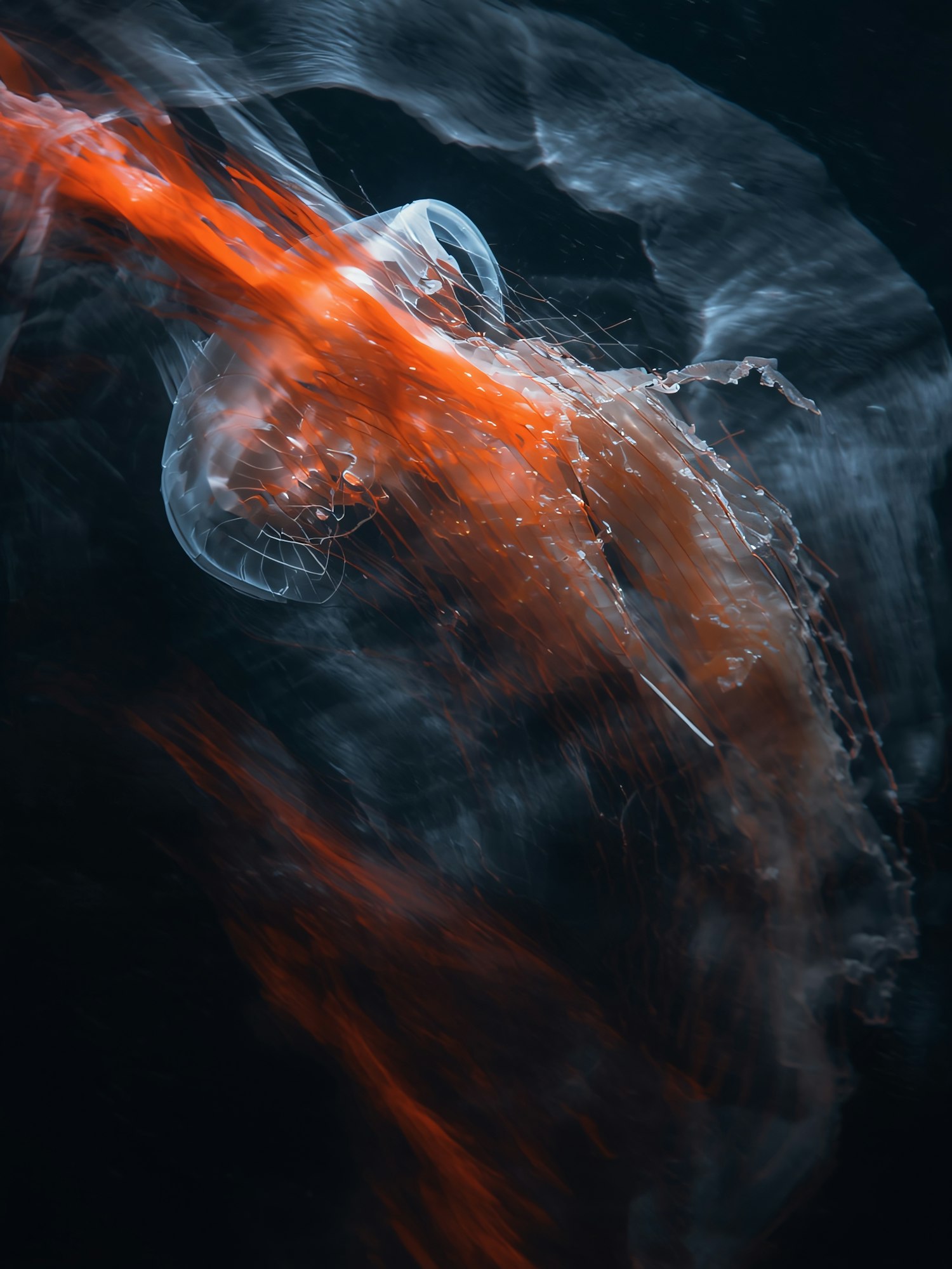 A glowing jellyfish with vibrant orange trails in a dark underwater scene, showcasing the beauty of marine bioluminescence.