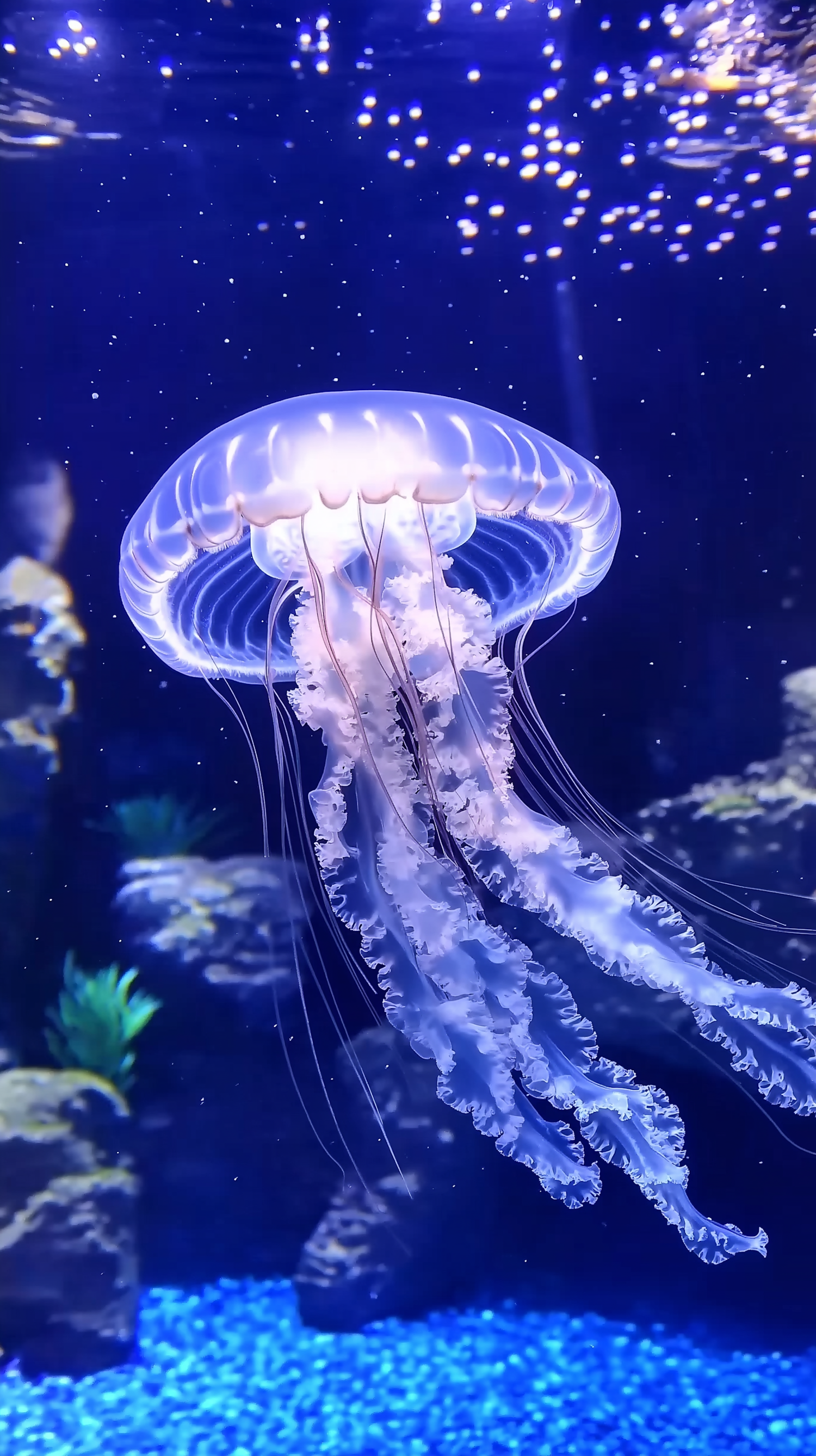 Ethereal jellyfish glows in a deep blue aquarium, with delicate tentacles and serene aquatic surroundings.