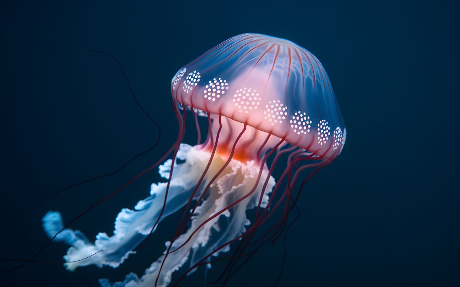A glowing jellyfish with white dots and pink tentacles floats in the deep blue ocean, creating a serene and ethereal scene.
