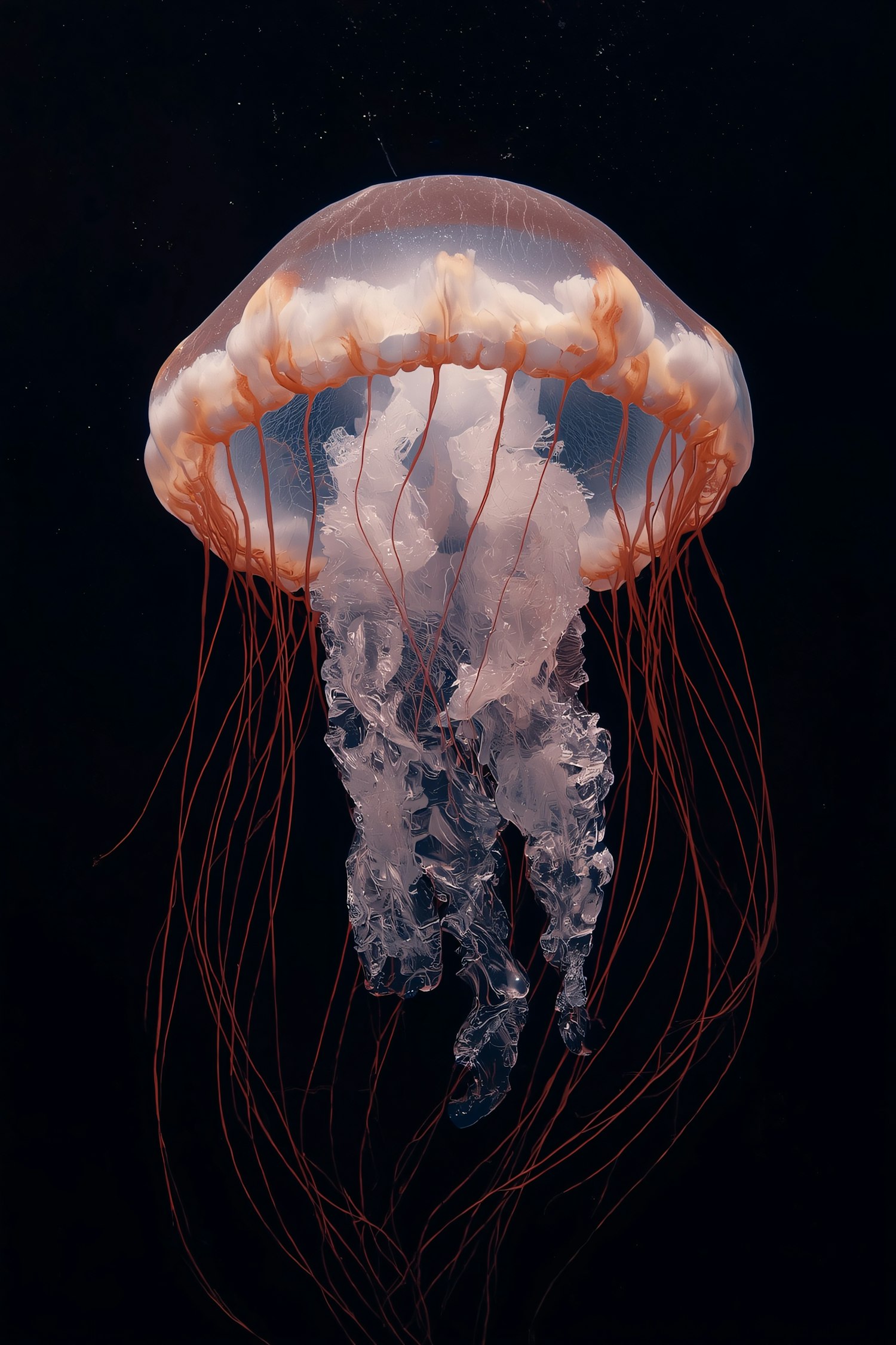 A glowing jellyfish with translucent orange and white hues floats gracefully in dark ocean waters, showcasing its delicate tentacles.