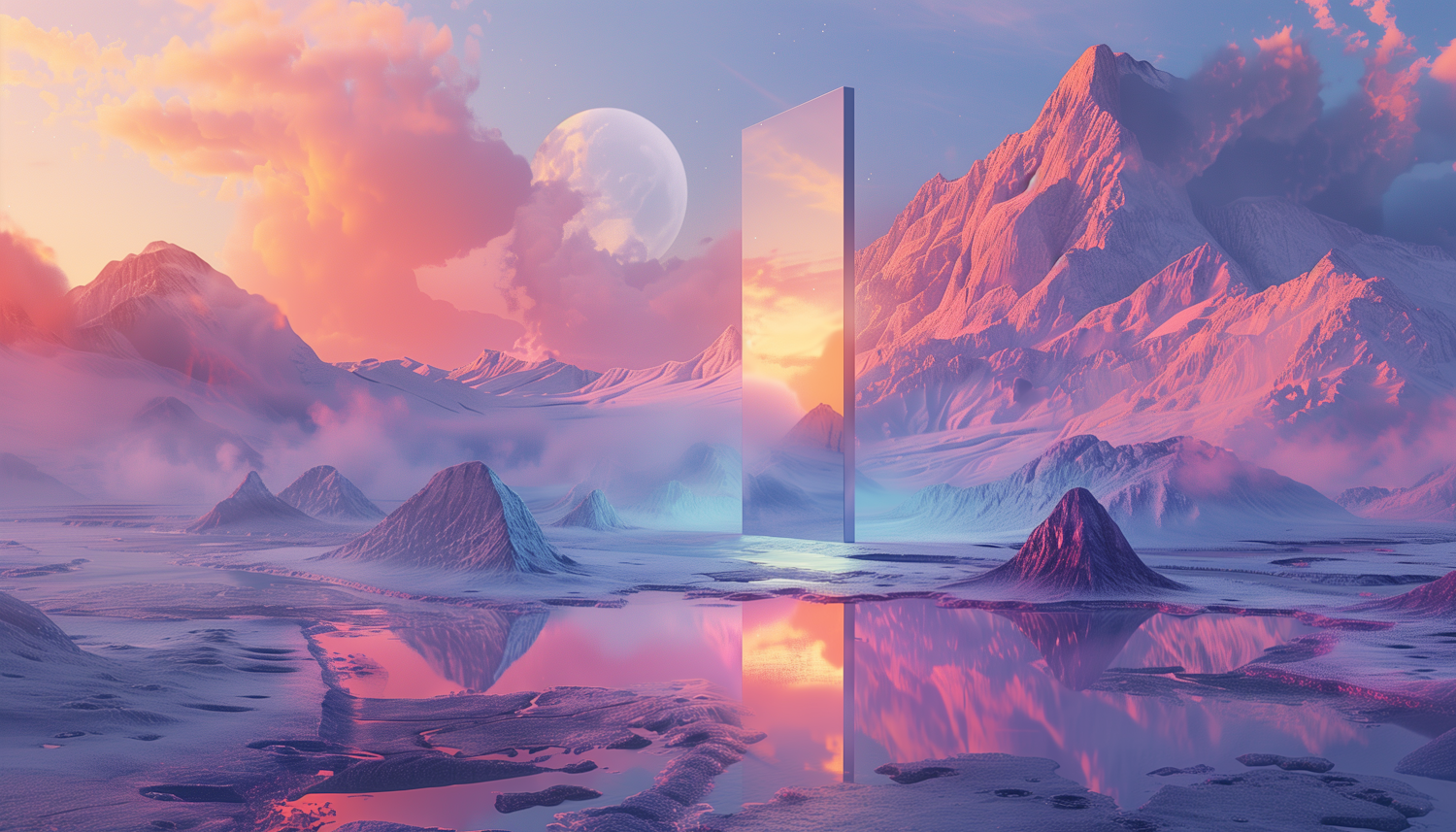 Surreal landscape with pink-hued mountains, a reflective monolith, and a glowing sunset mirrored in calm waters under a large moon.