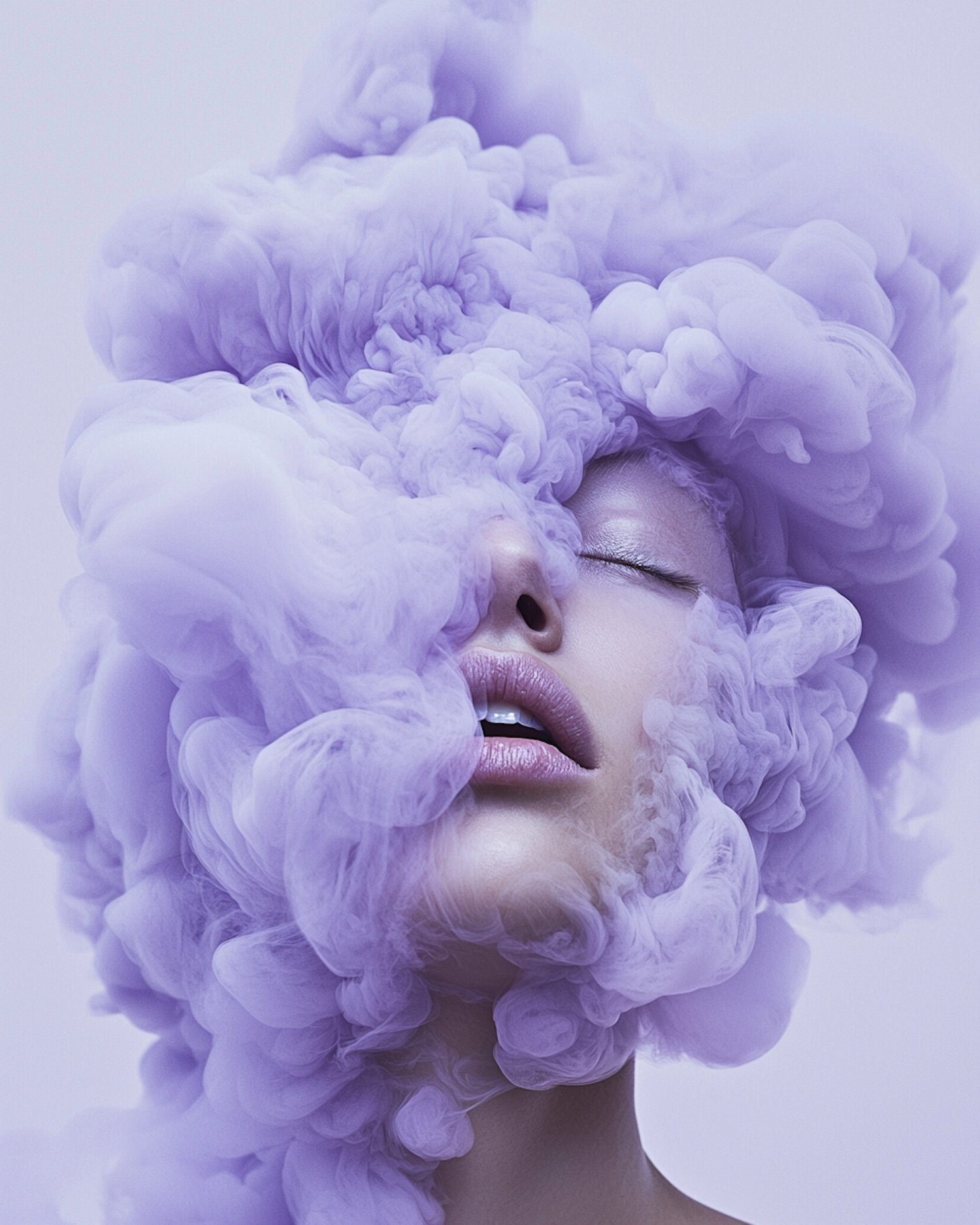 A dreamy portrait of a woman with closed eyes, her face surrounded by swirling lavender smoke, creating a surreal and artistic vibe.