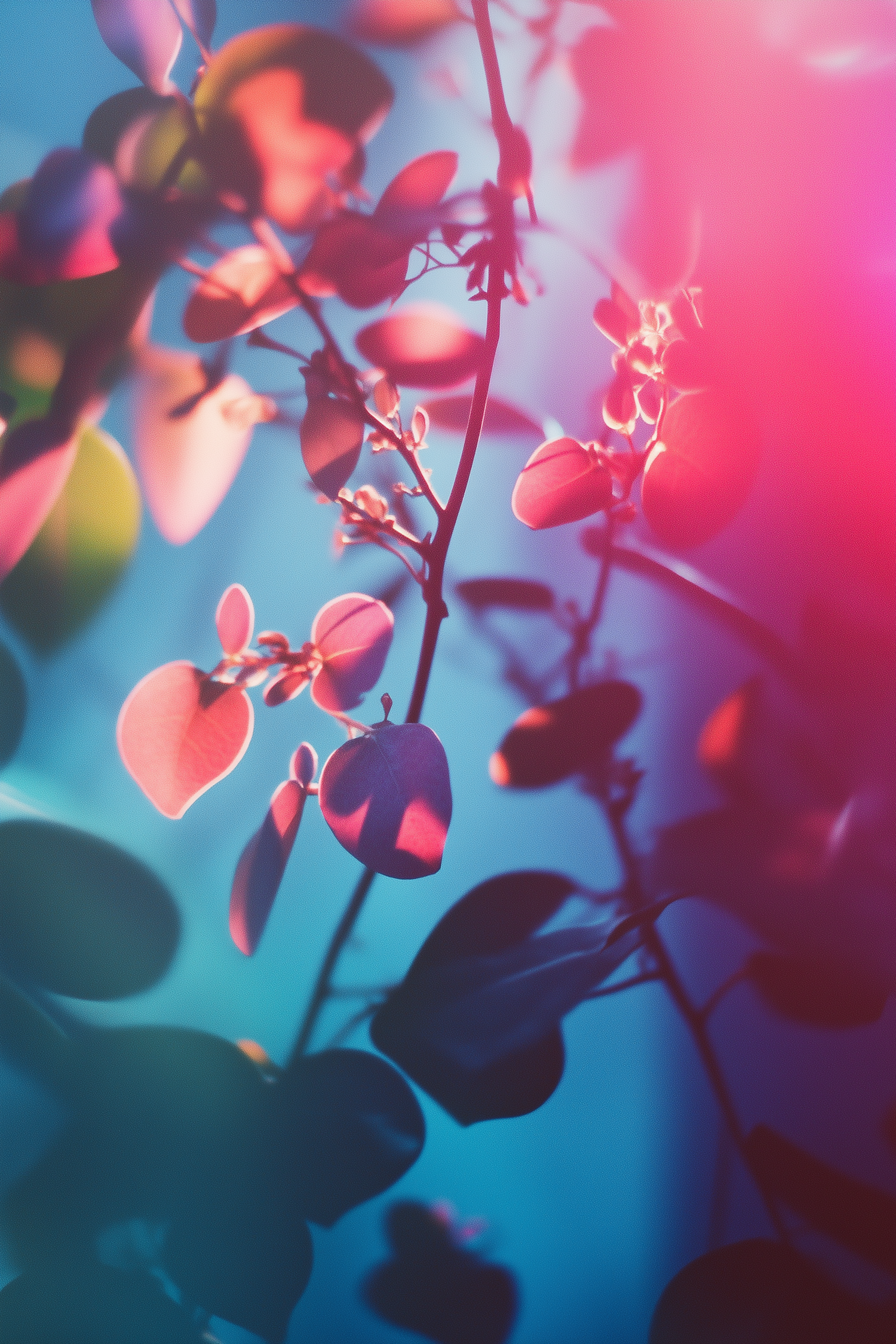 Vibrant close-up of leaves with dreamy pink and blue lighting, creating an ethereal and tranquil atmosphere.