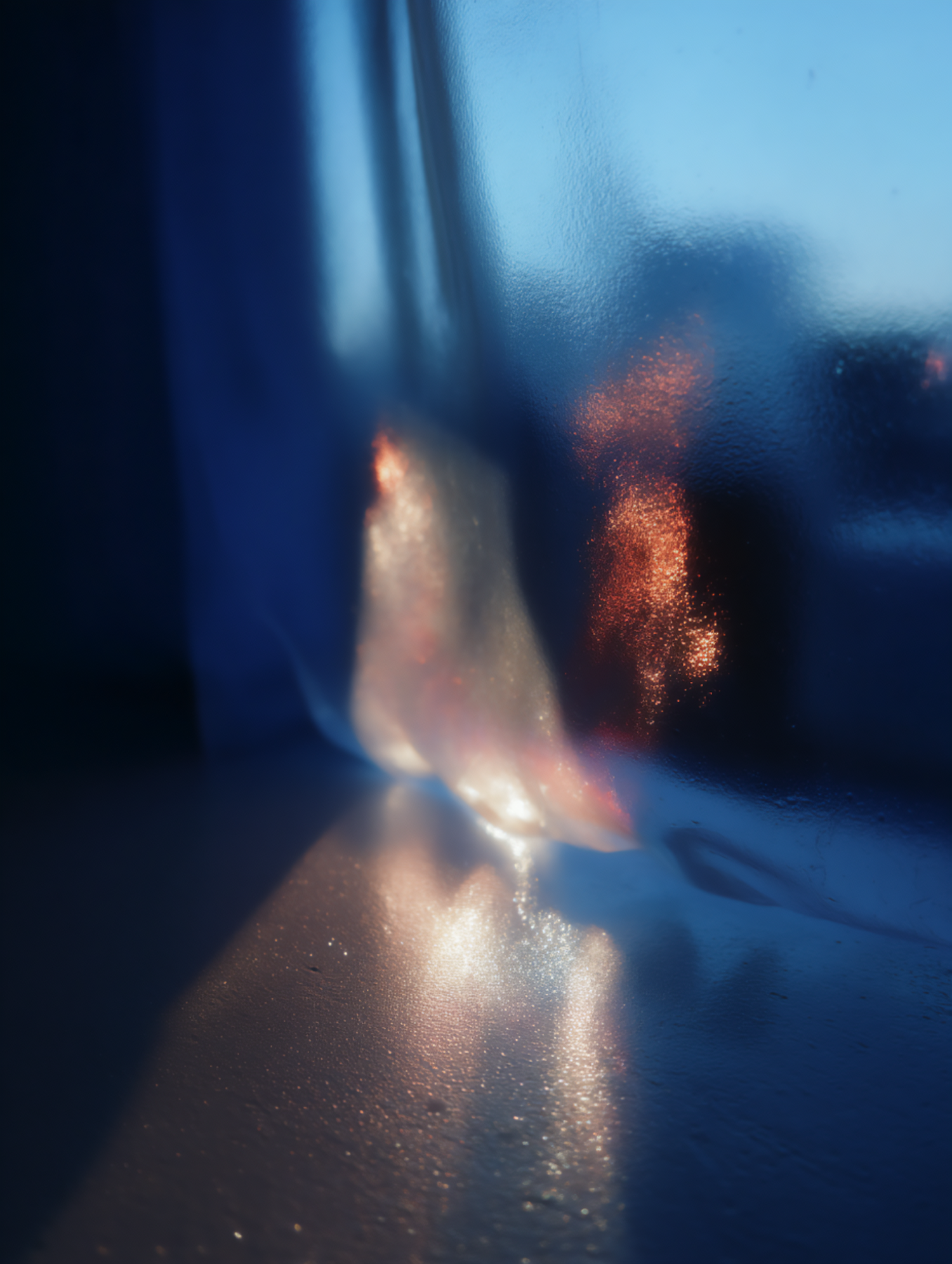 Abstract light reflections on a frosted surface with soft blue and golden hues, evoking a dreamy and tranquil ambiance.