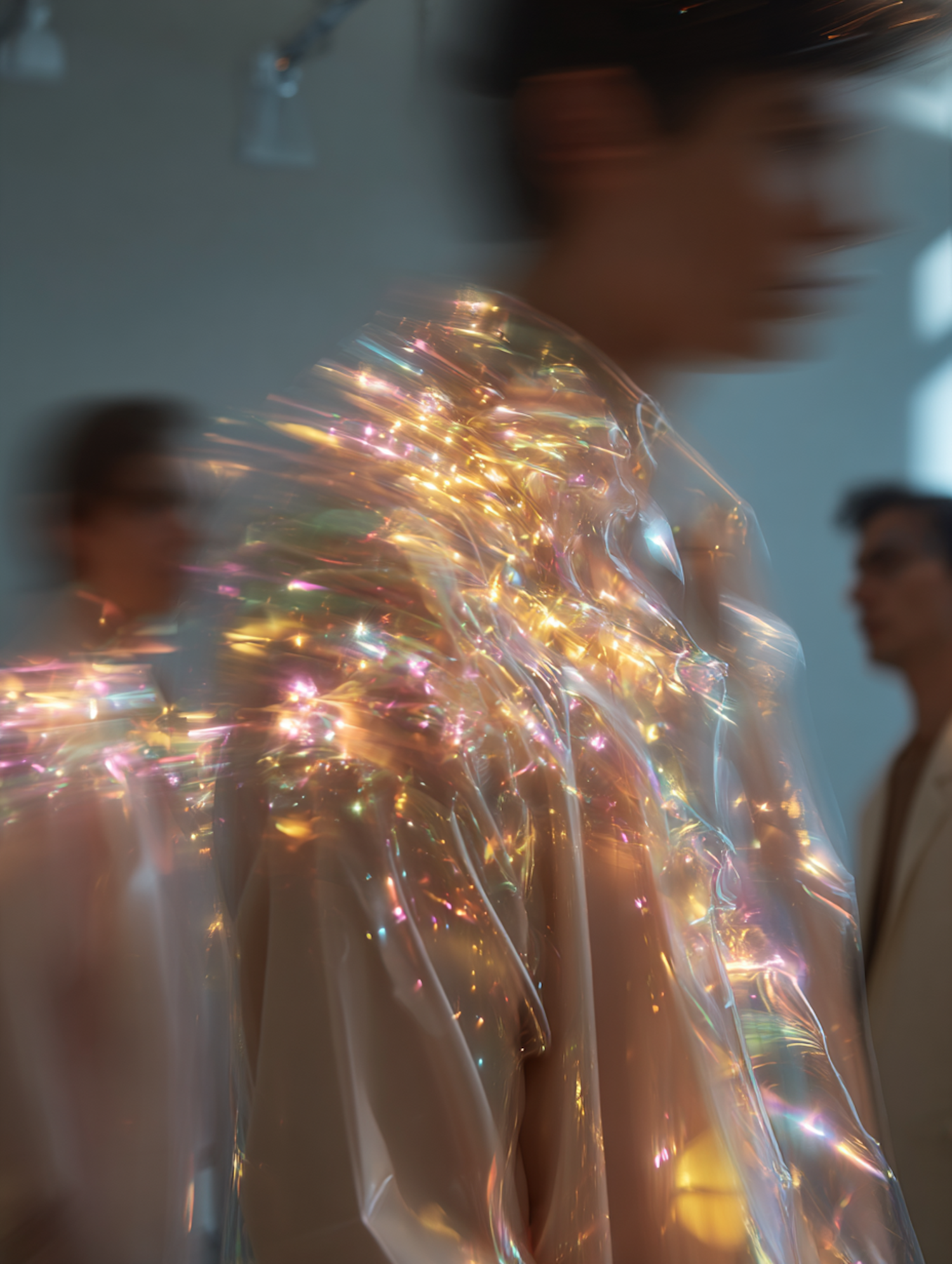 A dreamy, blurred image showcasing a translucent material refracting light into vibrant colors, creating an ethereal and artistic effect.