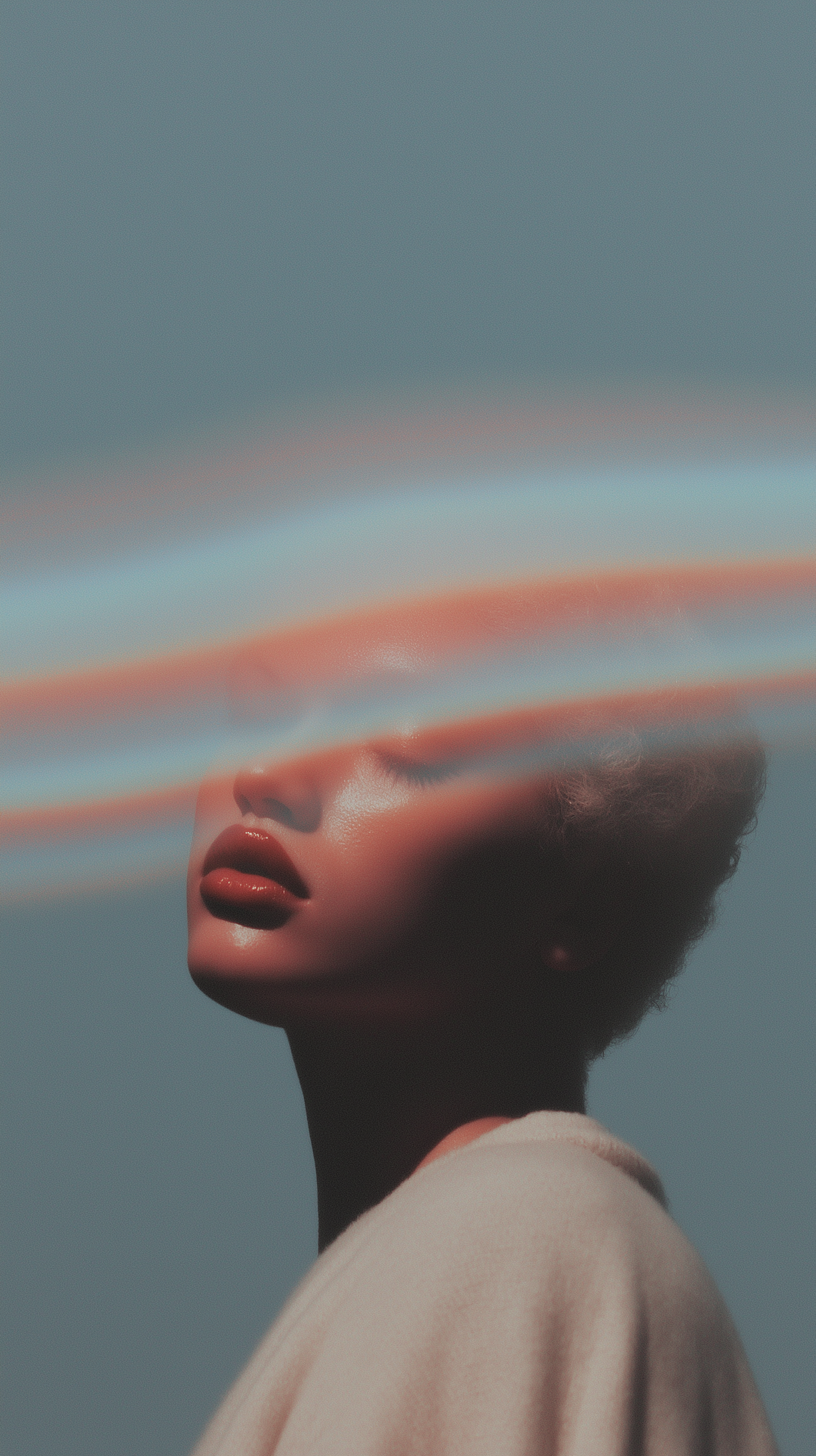 A dreamy portrait with pastel light streaks across a serene face, set against a muted blue background for an ethereal vibe.