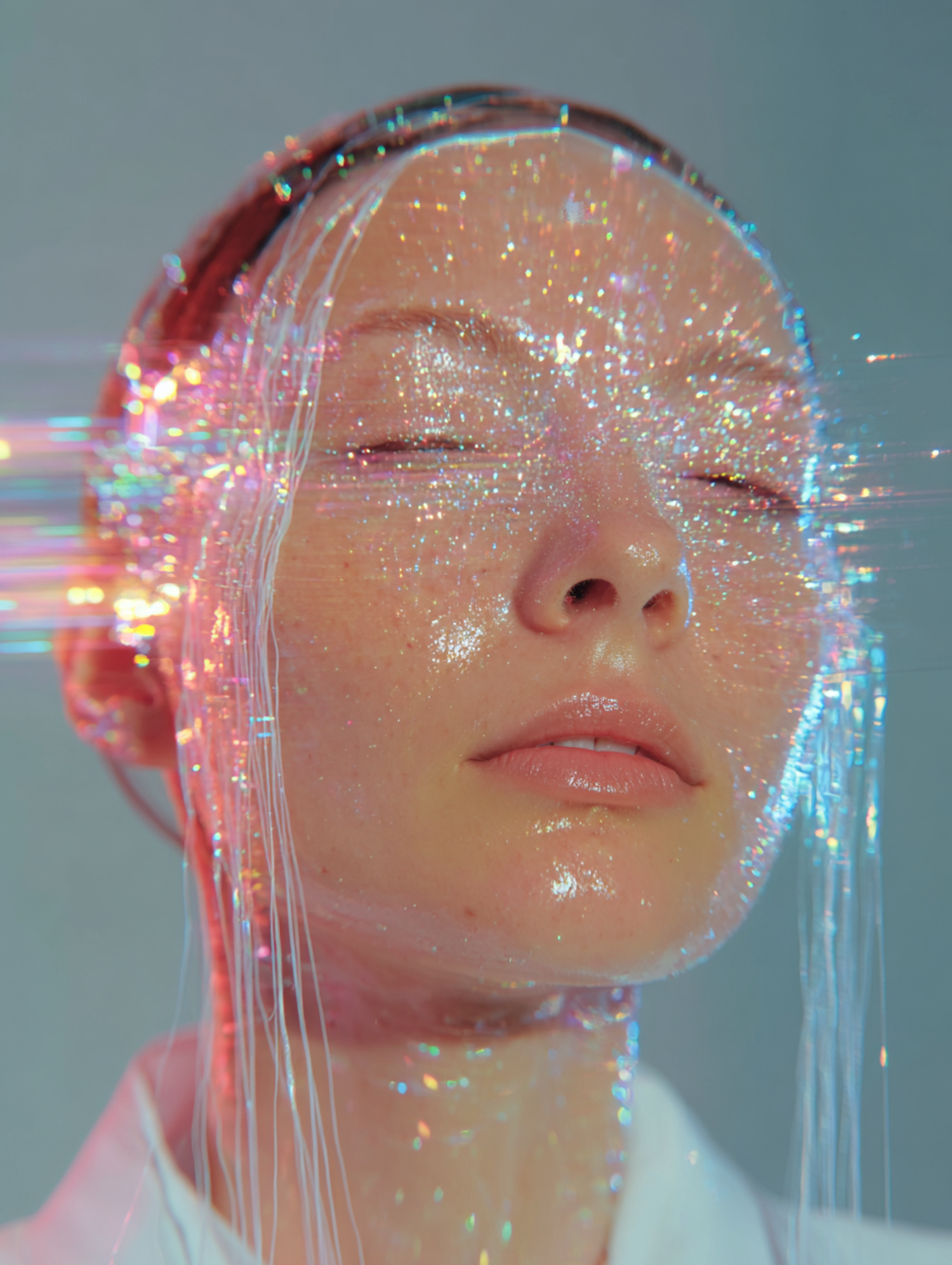 A close-up of a person with shimmering light effects on their face, creating a surreal and artistic visual.