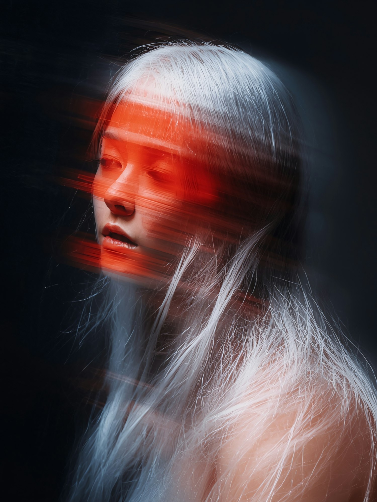 A surreal portrait with white hair and red light streaks, creating a dynamic and ethereal visual effect against a dark background.