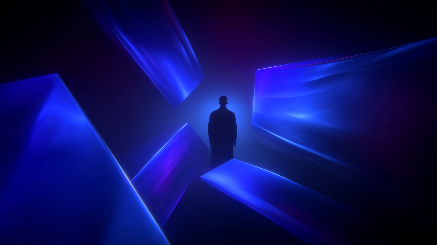 A silhouette stands in a futuristic setting with glowing blue and purple light panels, creating a mysterious and ethereal atmosphere.