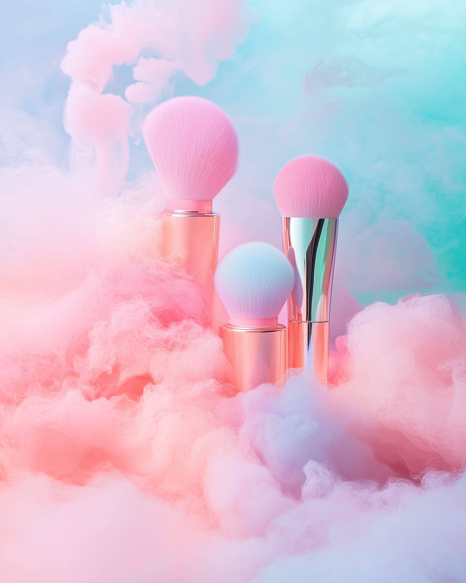 Elegant makeup brushes with pastel bristles in a dreamy pink and blue cloud setting, featuring rose gold handles.