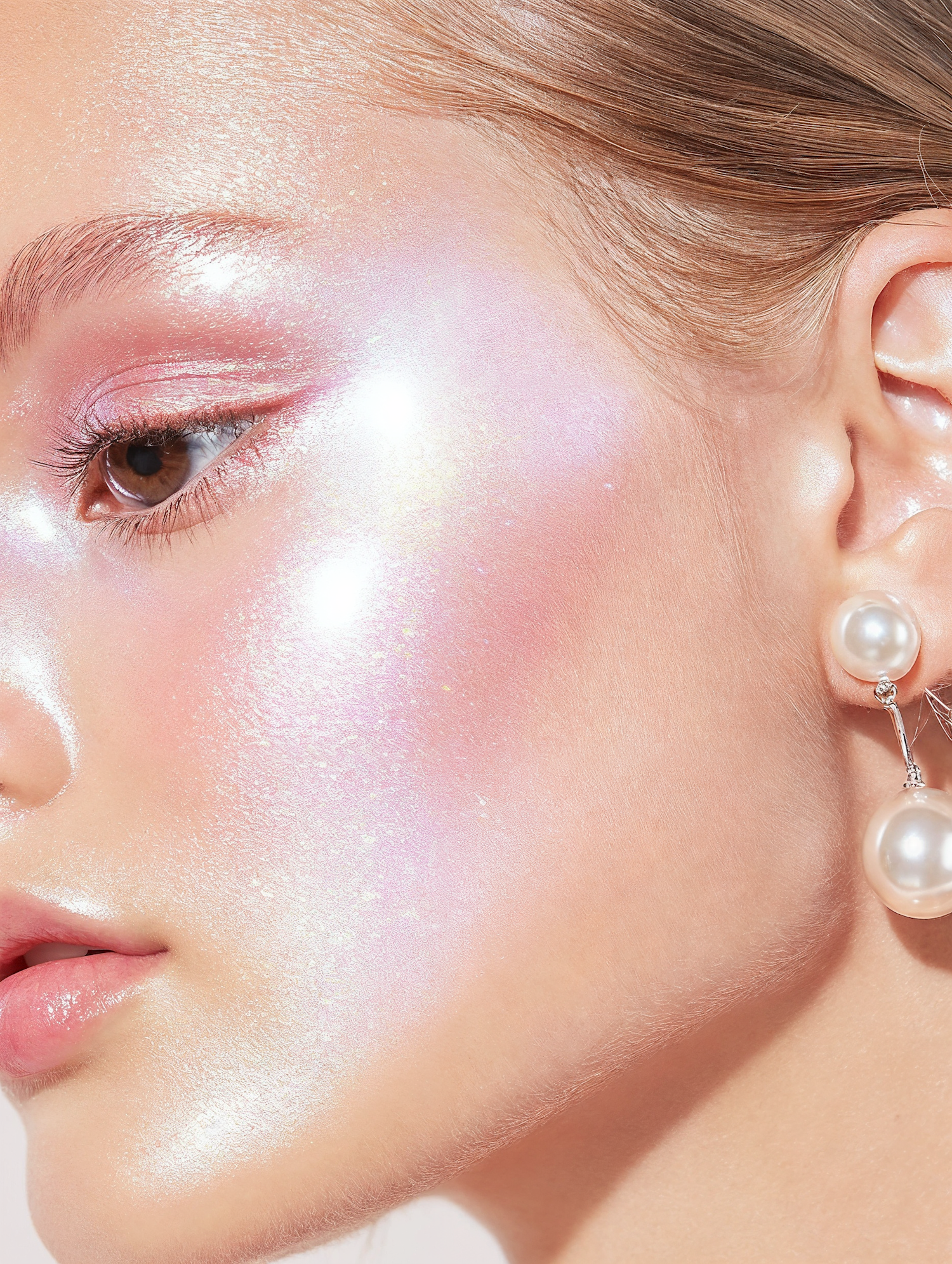 Close-up of glowing iridescent makeup with pink tones, glossy lips, and elegant pearl earrings for a radiant, ethereal look.