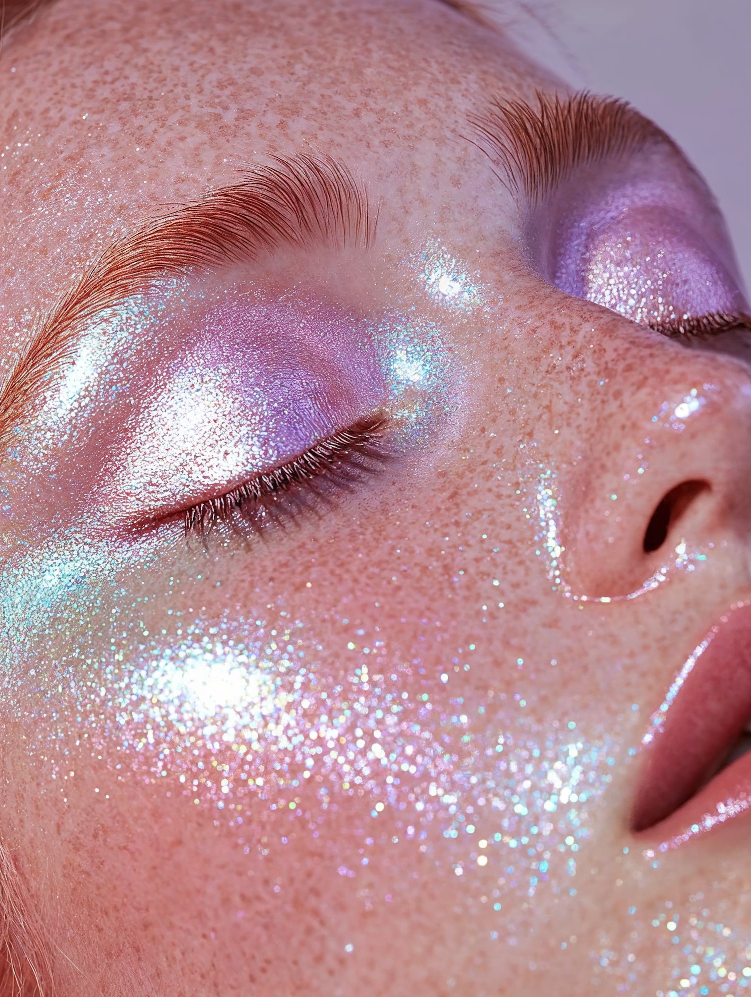 Close-up of freckled skin with lavender eyeshadow, holographic glitter highlights, and glossy pink lips for a dreamy, iridescent makeup look.