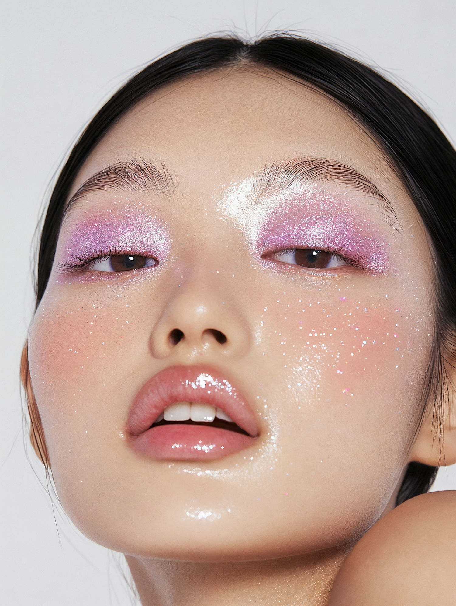 Close-up of a woman with shimmering pink eyeshadow, glossy lips, and a dewy complexion, creating a radiant and ethereal makeup look.