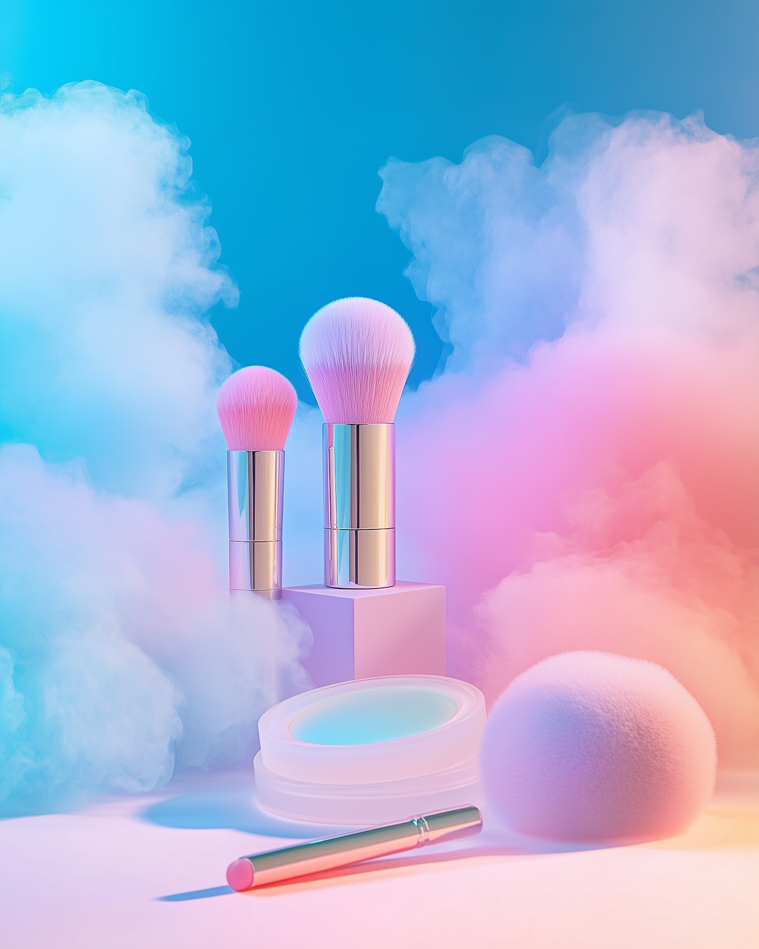Dreamy makeup scene with pastel brushes, a powder puff, and colorful smoke. Perfect for beauty and cosmetics enthusiasts.