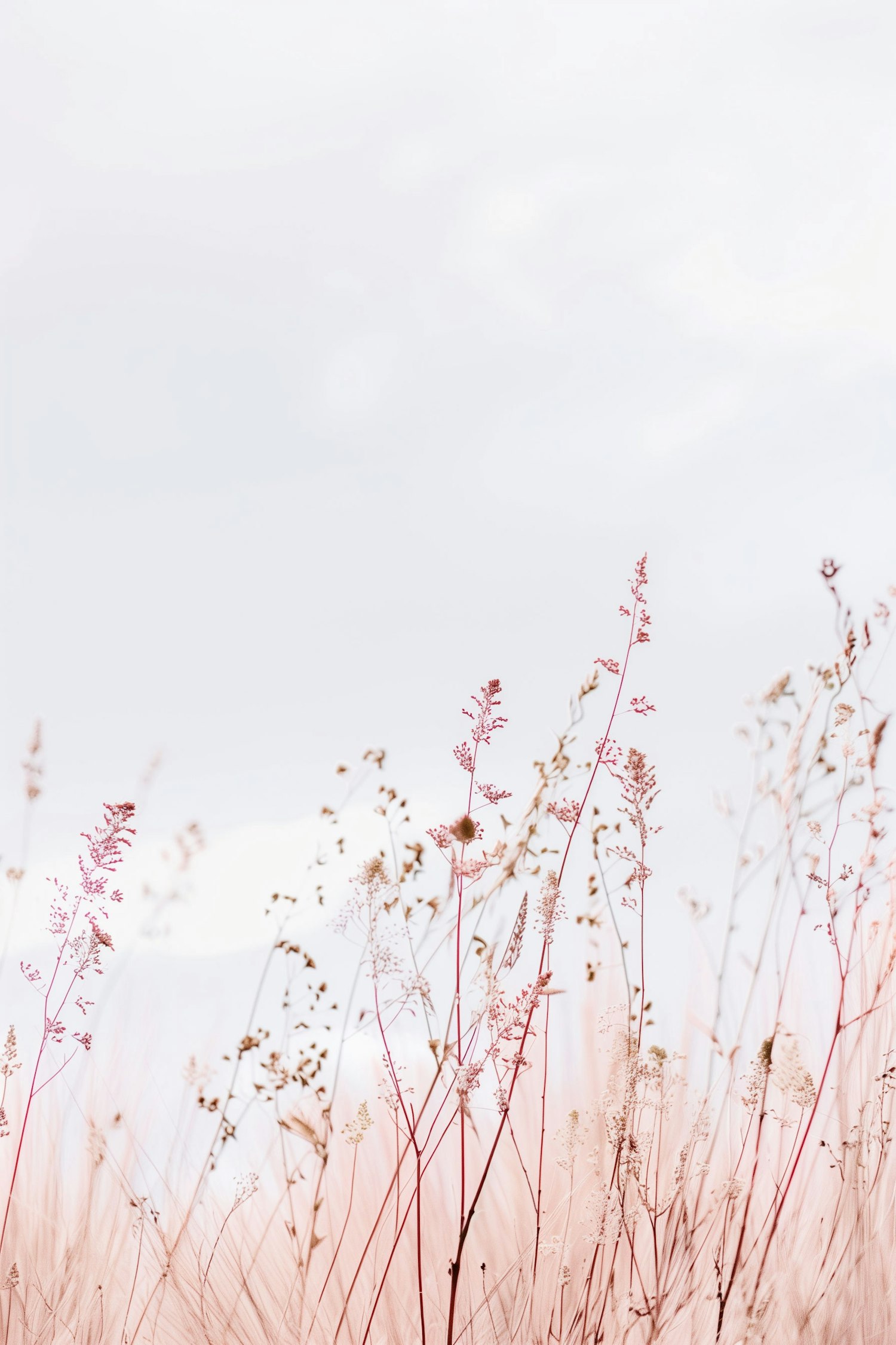Delicate wild grasses with pinkish-red stems against a soft, overcast sky create a serene and minimalist nature scene.