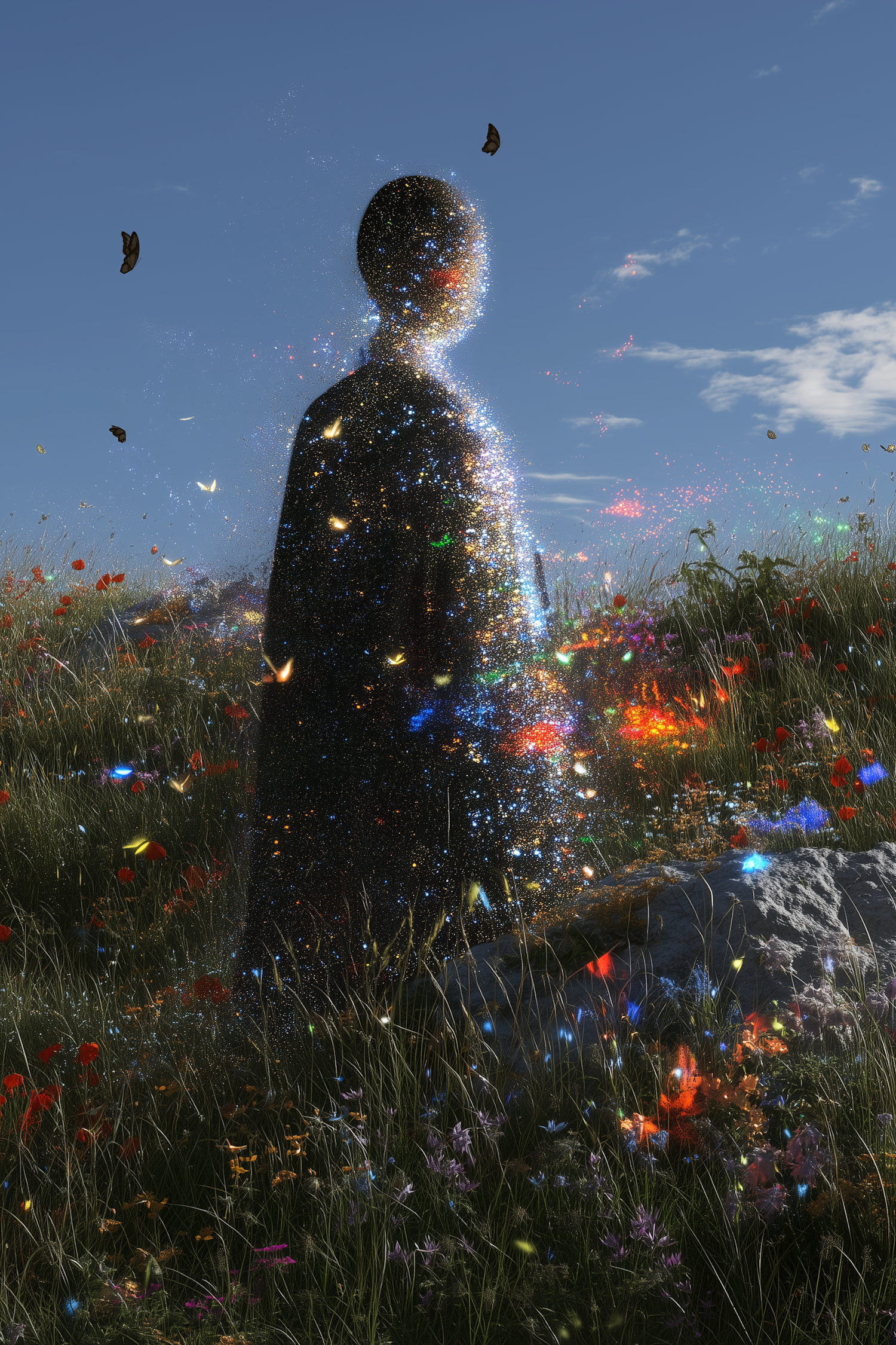 A shimmering humanoid figure dissolves into light amidst a vibrant meadow, surrounded by butterflies and glowing orbs under a clear sky.