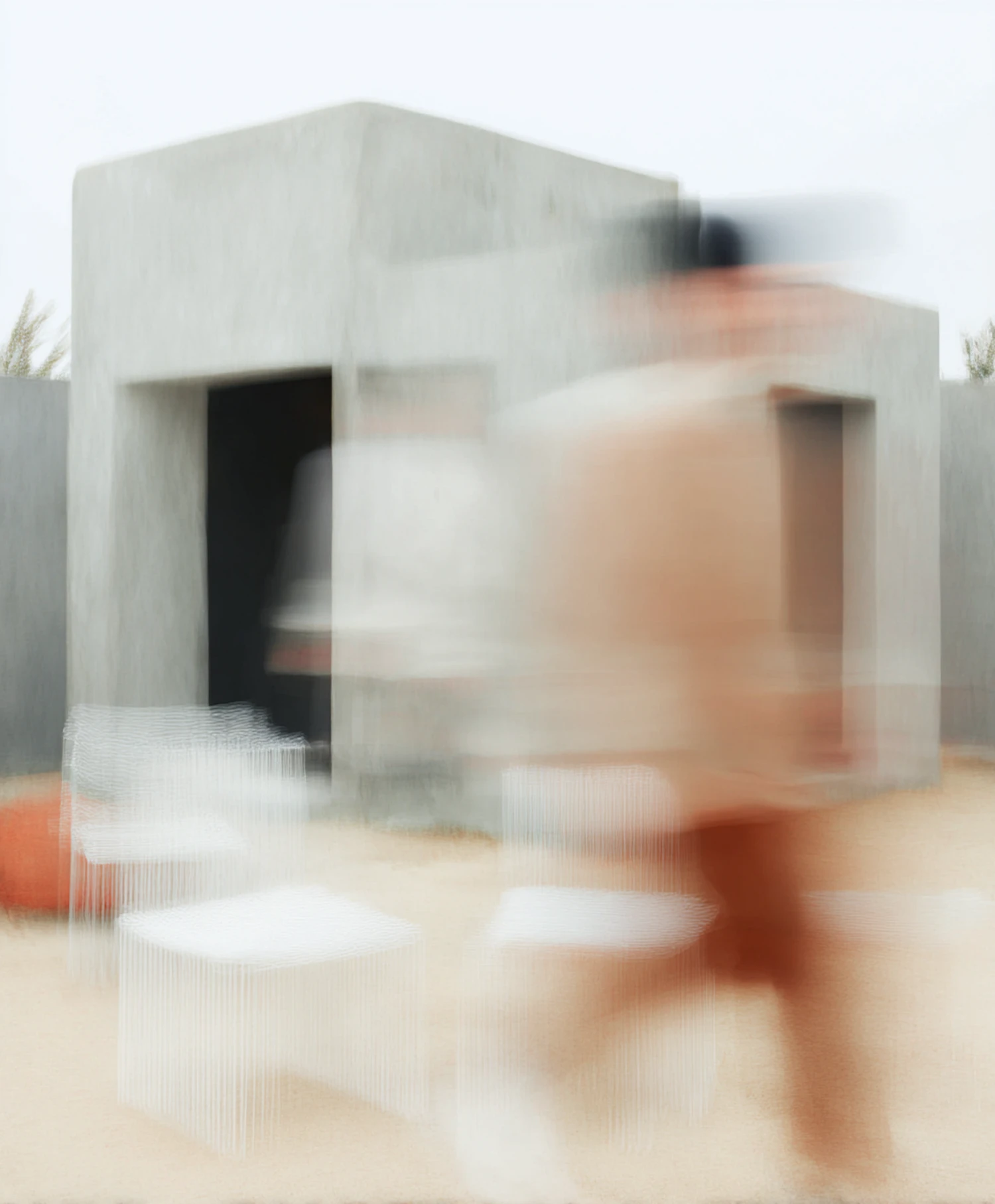 A blurred figure moves past a minimalist concrete structure with abstract chairs in the foreground, creating a dreamlike atmosphere.