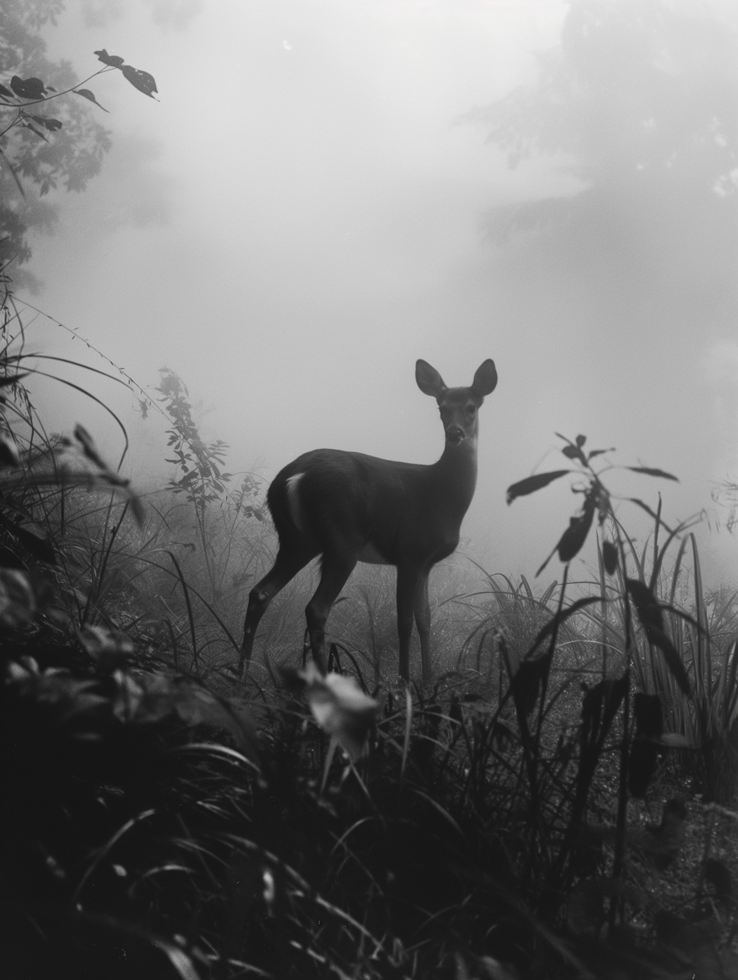 A deer stands gracefully in a misty forest, captured in a serene black and white photograph, evoking a sense of tranquility and mystery.