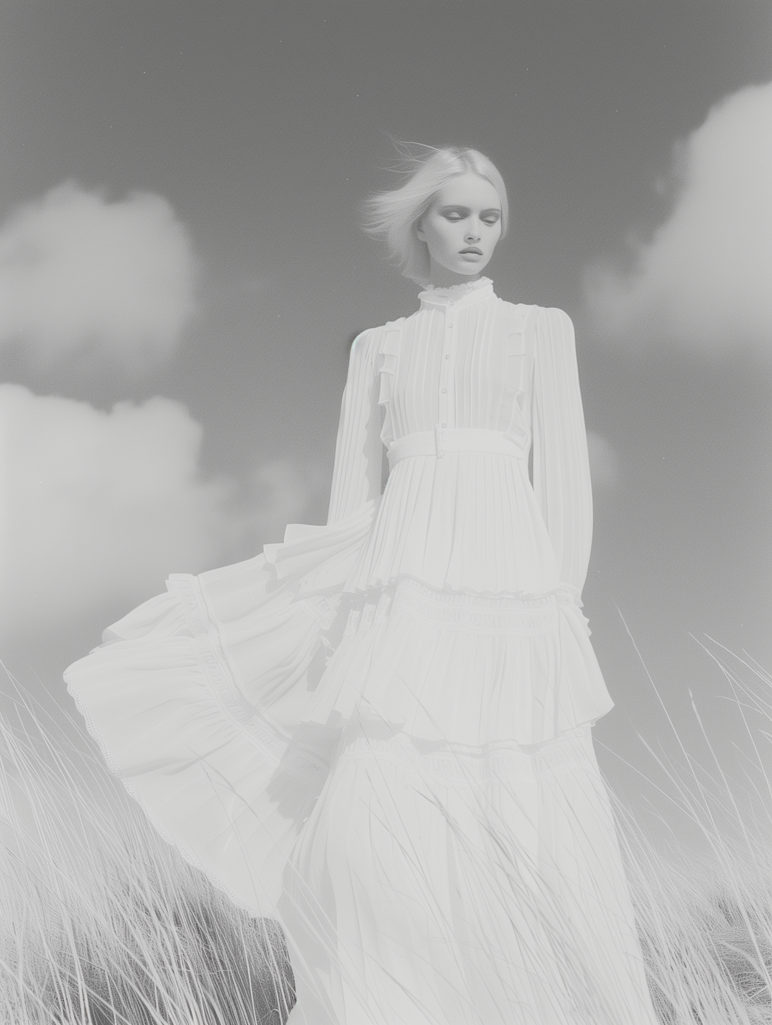 Ethereal scene of a woman in a flowing white dress in a field, under a cloudy sky. Monochrome tones enhance the dreamy atmosphere.