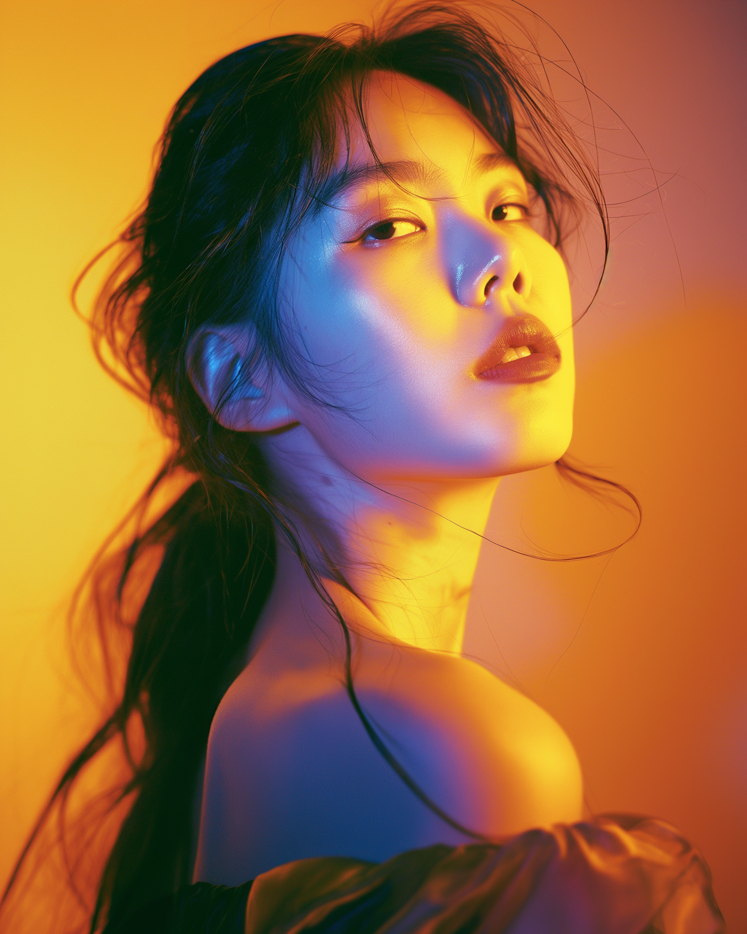 Artistic portrait of an Asian woman with bold lighting in yellow and blue tones, highlighting her confident gaze and elegant pose.