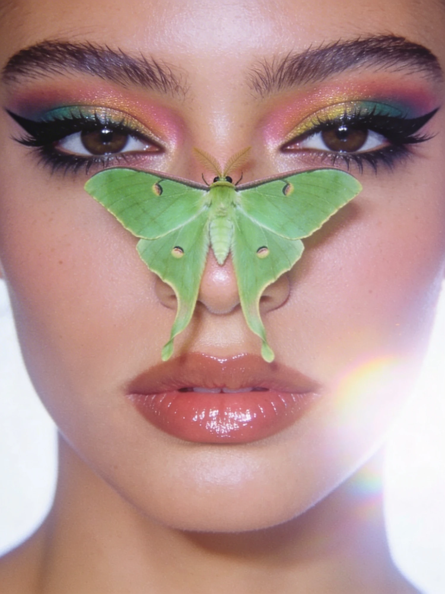 Close-up of a face with colorful makeup and a green luna moth on the nose, creating a striking and artistic composition.