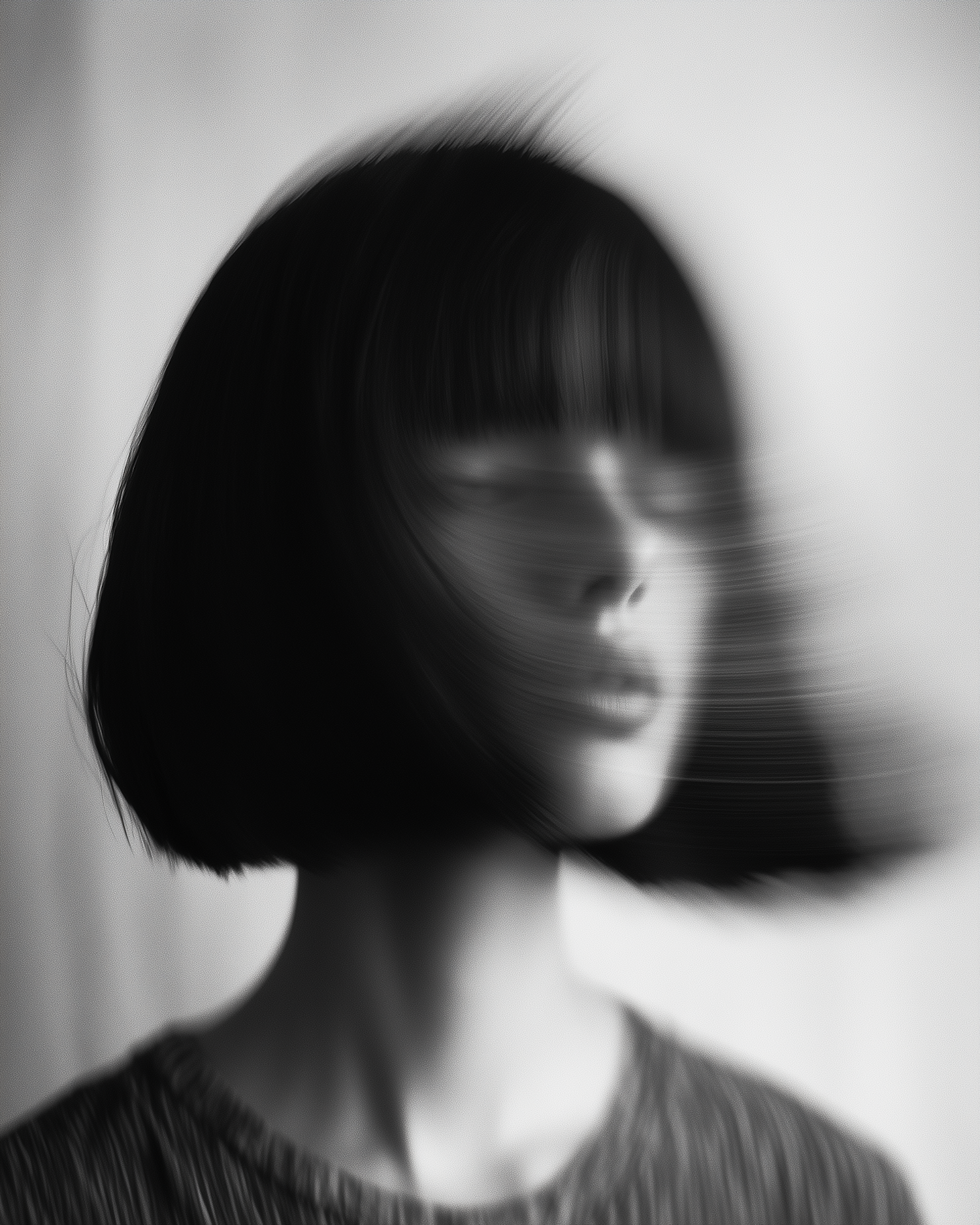 Artistic black and white photo of a person with a blurred face and bob haircut, creating a mysterious and dynamic effect.