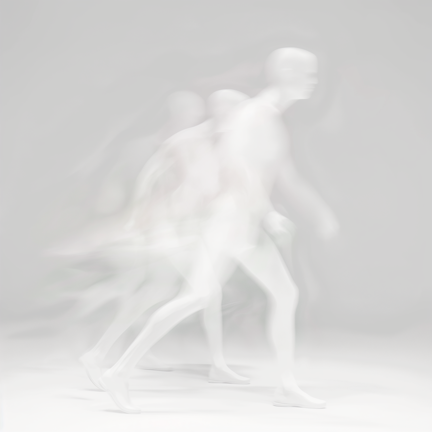 Abstract image of ghostly, translucent human figures in motion, creating a surreal and dreamlike effect with soft whites and grays.