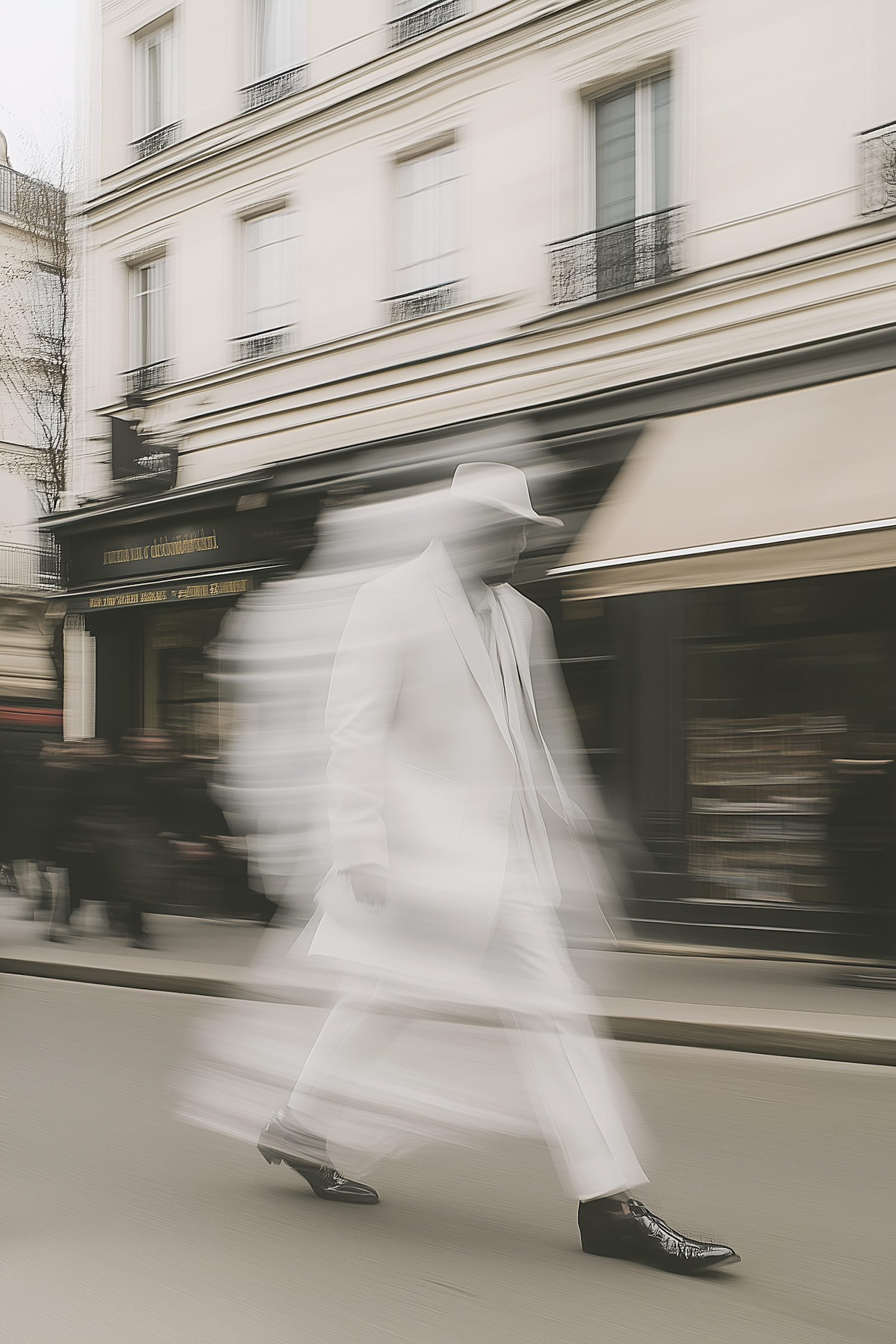 A man in a white suit and hat walks briskly, creating a ghostly blur against a classic European city backdrop.