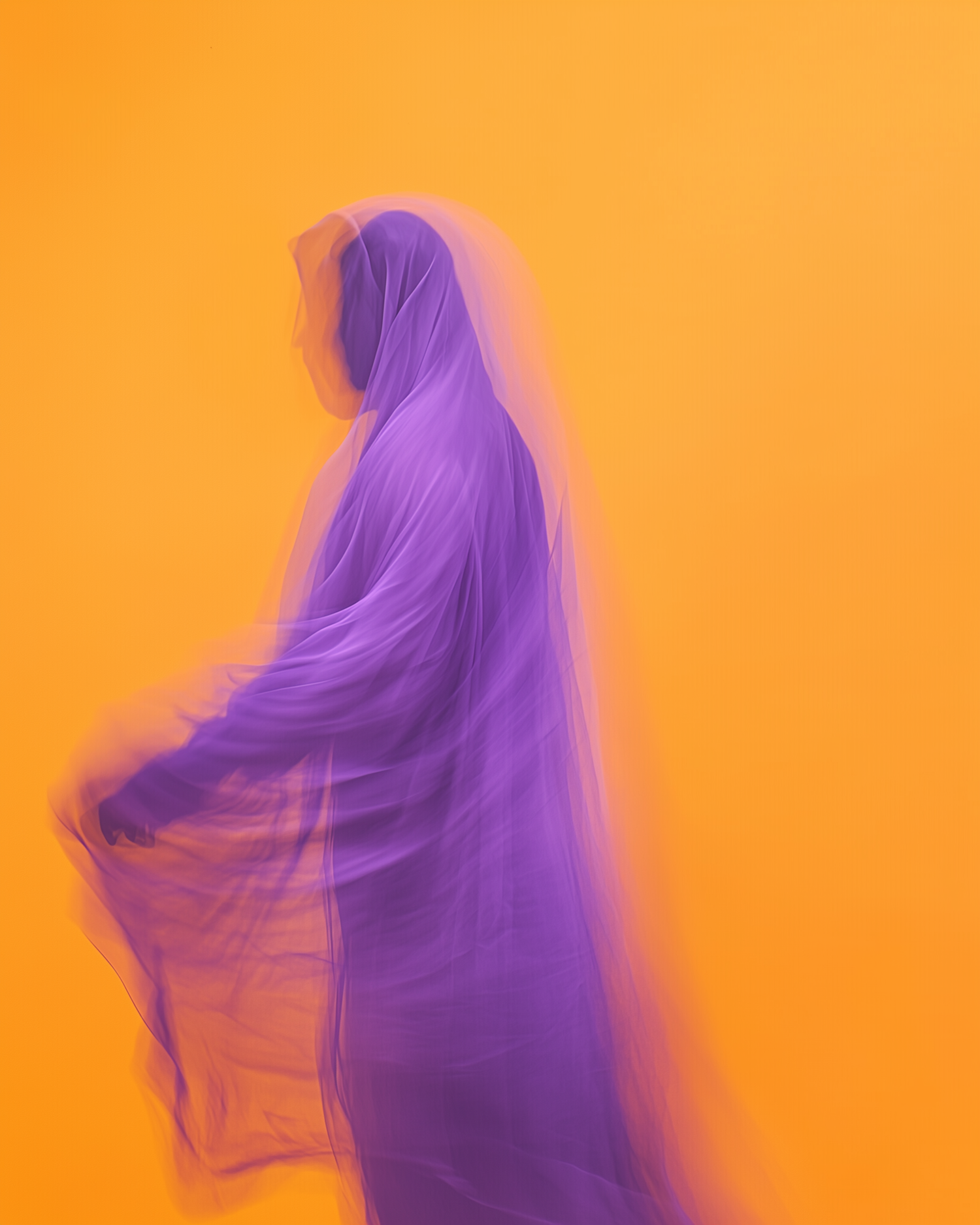 Ethereal figure in motion with flowing purple fabric against a vibrant orange background, creating a dynamic and minimalist composition.