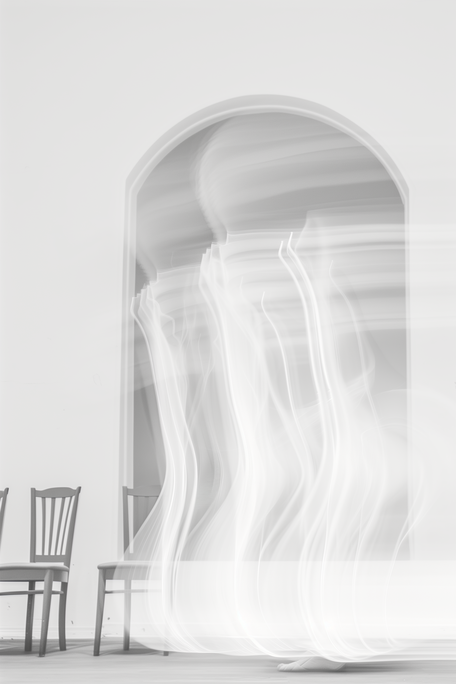 Ethereal monochrome image of a ghostly figure in motion near an arched doorway, with wooden chairs adding a minimalist touch.