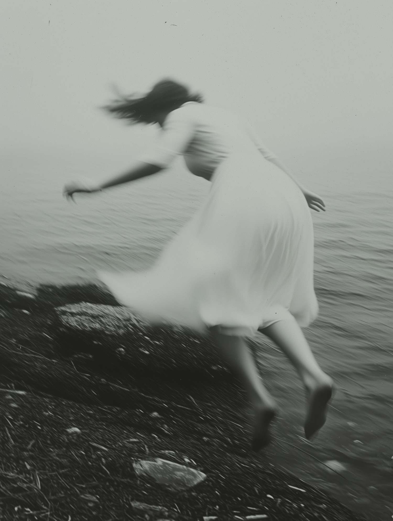 Blurred image of a person in a white dress leaping towards water, creating a dreamlike, ethereal scene with monochromatic tones.