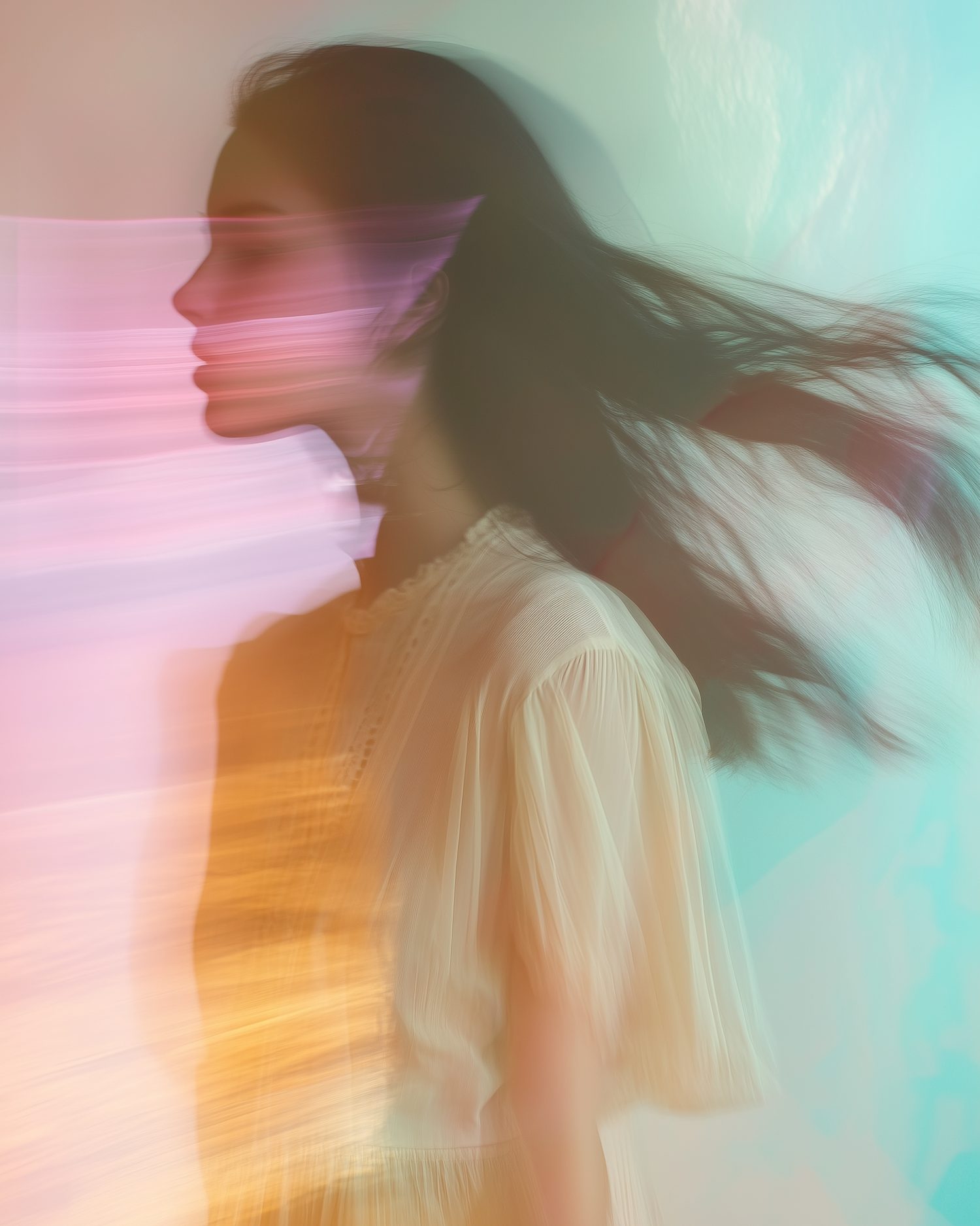 Ethereal portrait of a woman in motion blur, blending pastel hues of pink, orange, and teal for a dreamy, surreal effect.