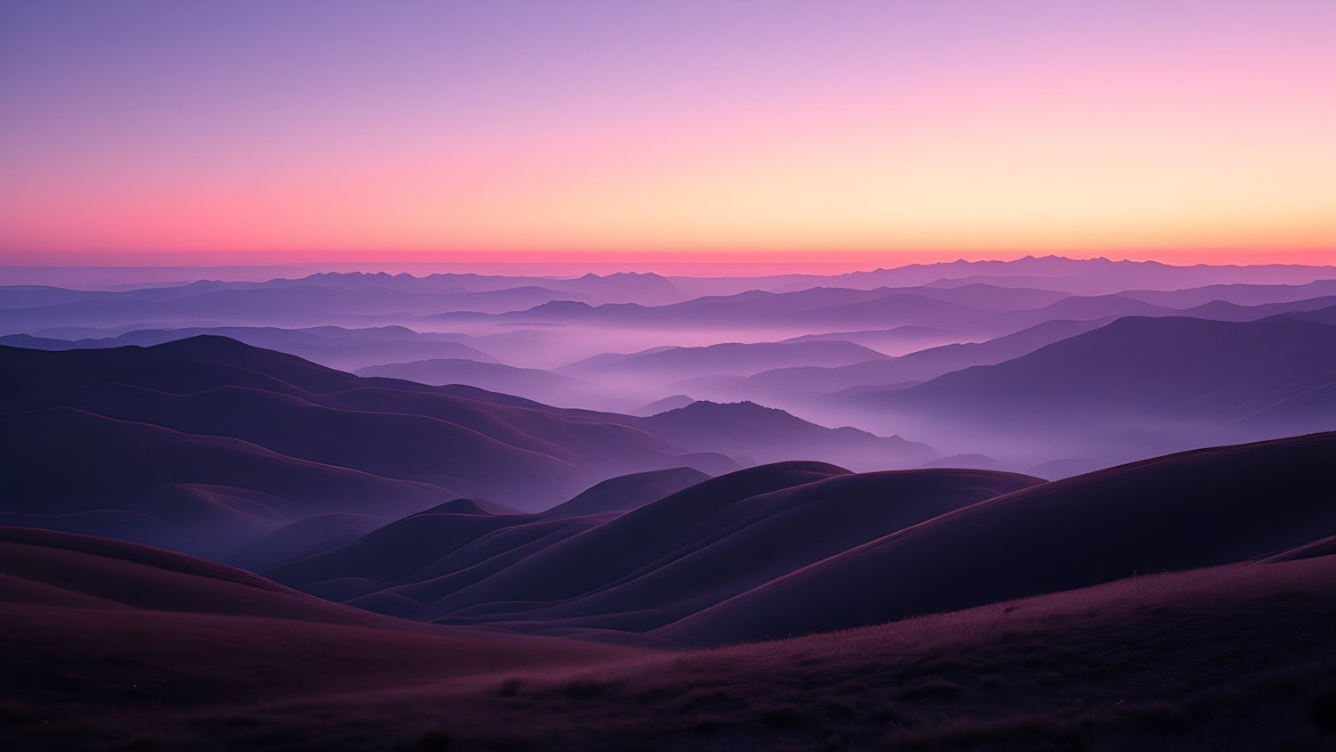 Dreamy landscape of misty hills and mountains at sunrise, painted in soft purple, pink, and orange hues. Perfectly serene and tranquil.