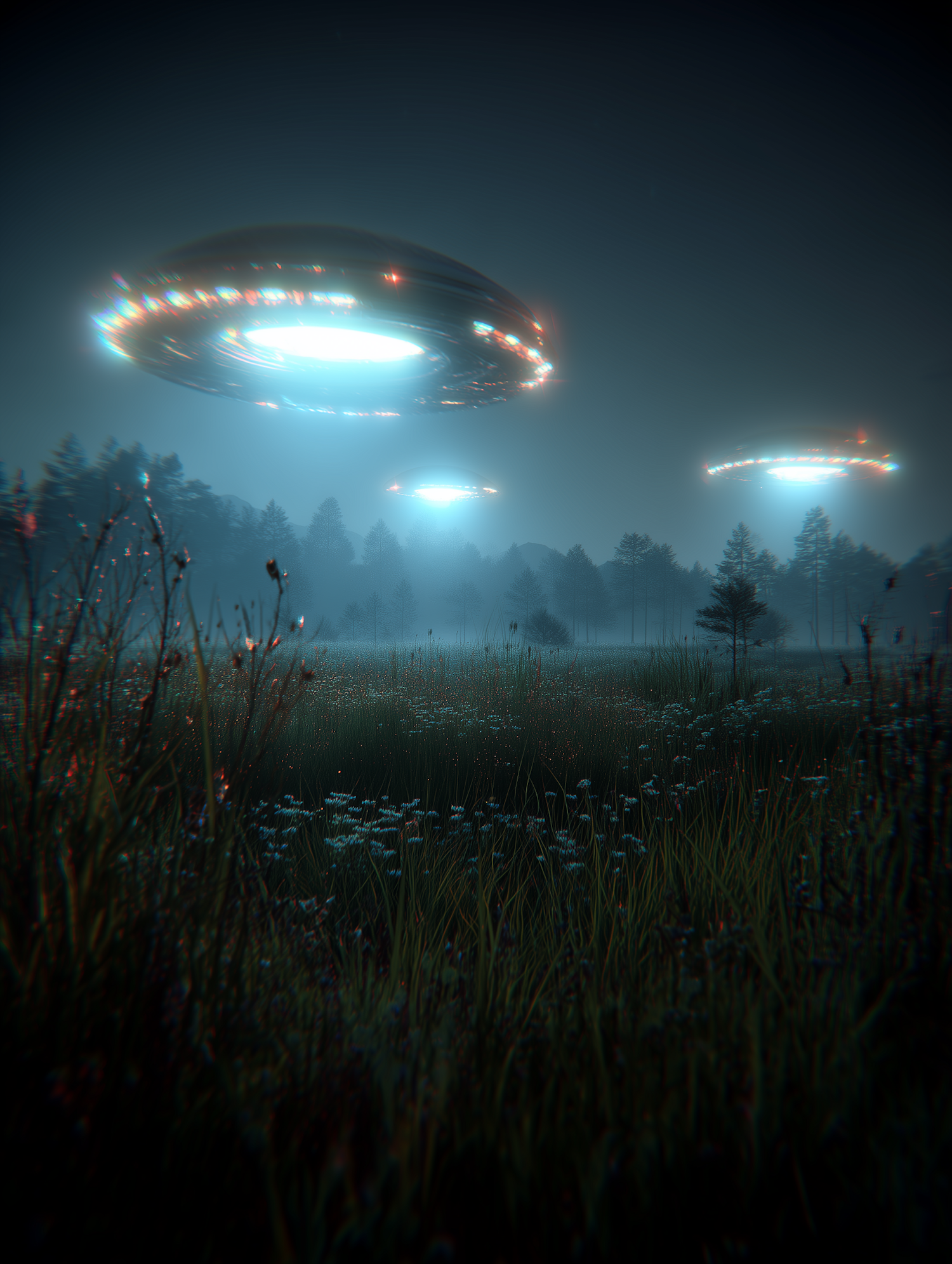 A misty field at night with glowing UFOs hovering above, casting light on the grass and trees, creating a mysterious and captivating scene.