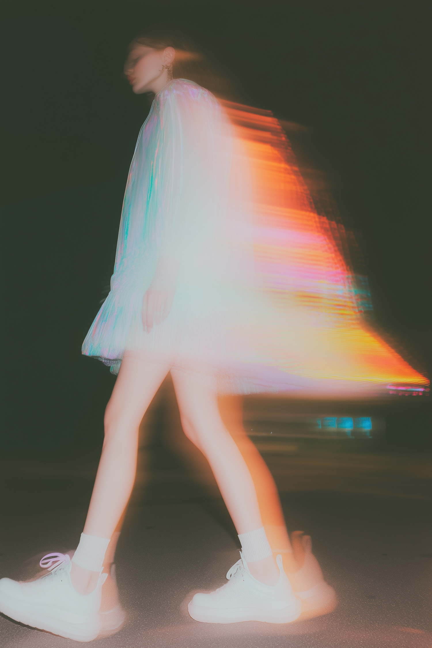 Blurred night shot of a person in an iridescent dress and white sneakers, with colorful light trails creating a dreamy effect.