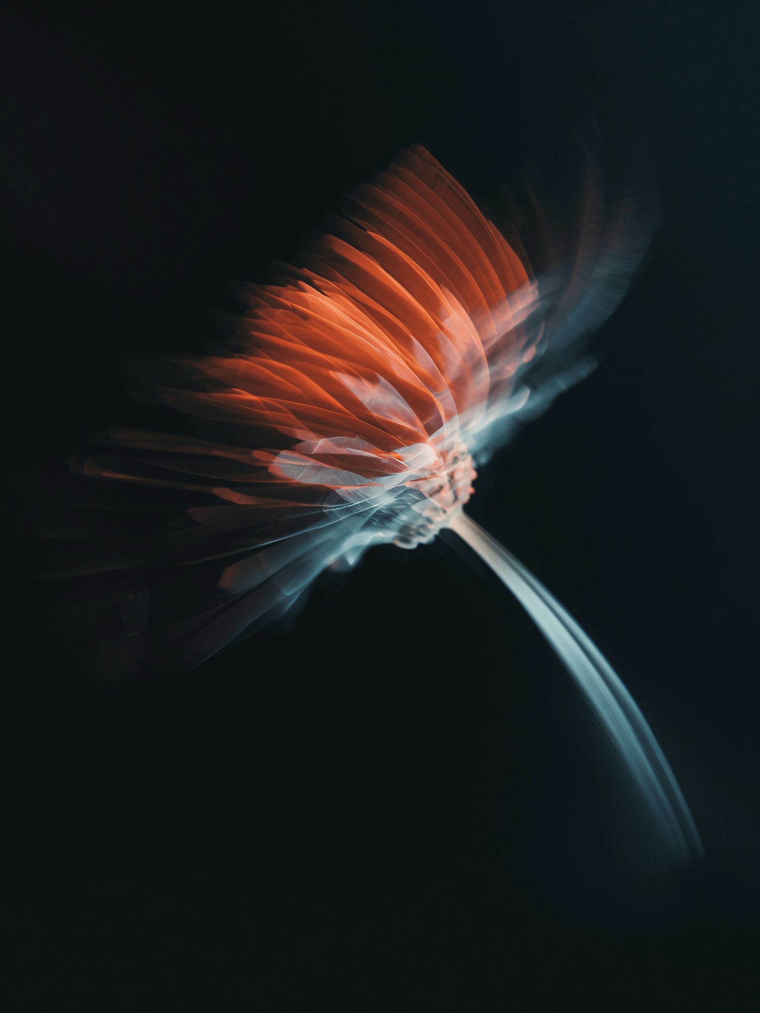A vibrant abstract image of a flower with orange petals in motion, set against a dark background, creating a dynamic and artistic effect.