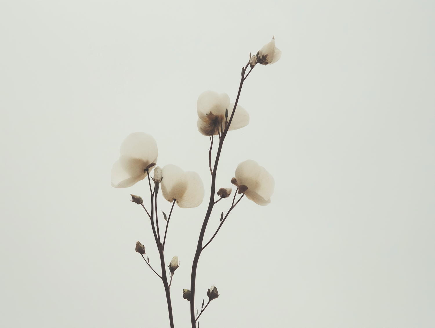 Elegant white orchids on slender stems against a soft, muted background, creating a serene and minimalist floral composition.
